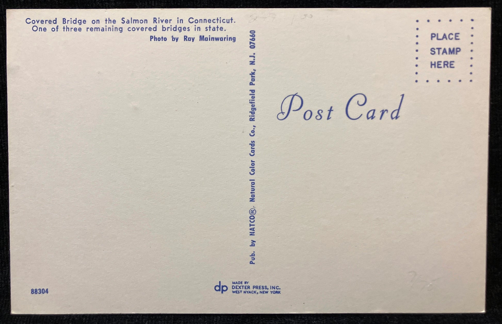On back: Covered Bridge on the Salmon River in Connecticut. One of the three remaining covered bridges in state. Photo by Ray Mainwaring