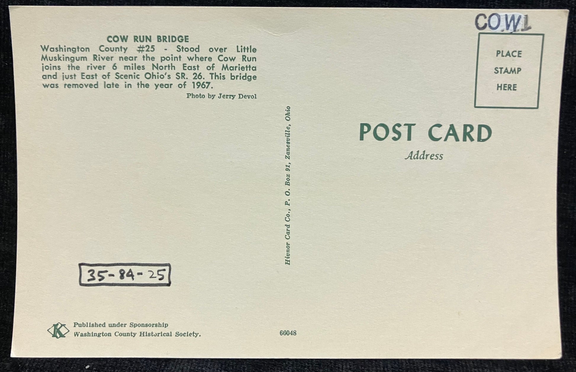 On back: COW RUN BRIDGE Washington County #25 - Stood over Little Muskingum River near the point where Cow Run joins the river 6miles North East of Marietta and just East of Scenic Ohio’s SR. 26This bridge was removed late in the year of 1967