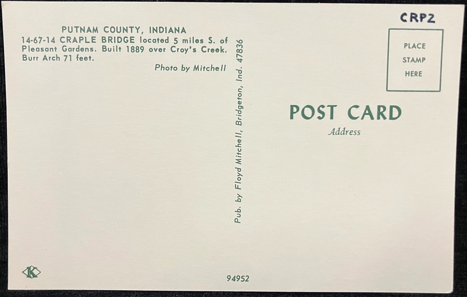 Craple Bridge in Putnam County, Indiana - Photo: Mitchell - Vintage Covered Bridge Postcard