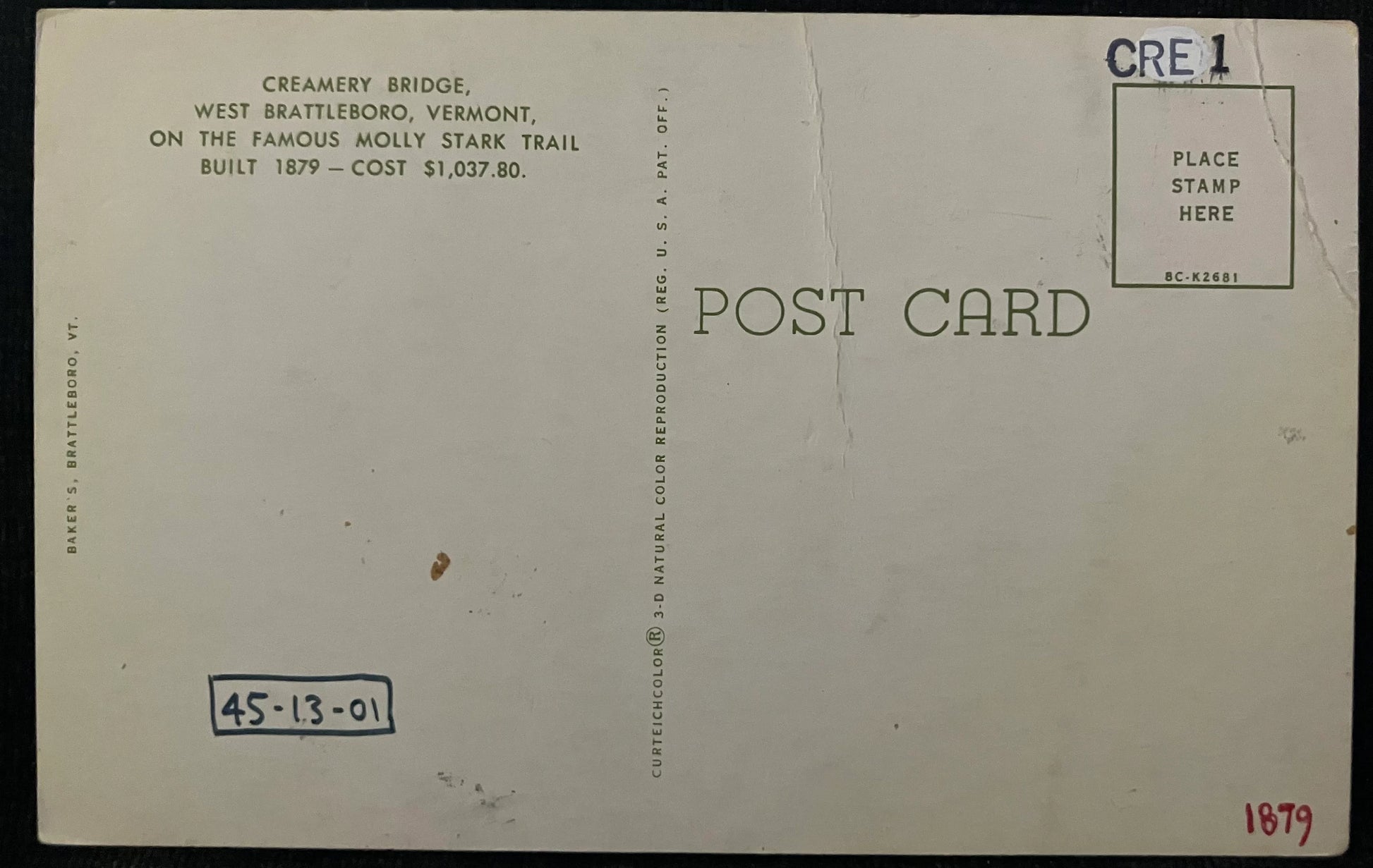 Back: Creamery Bridge, West Brattleboro, Vermont, On the Famous Molley Stark Trail Built 1879 - Cost $1,037.80.