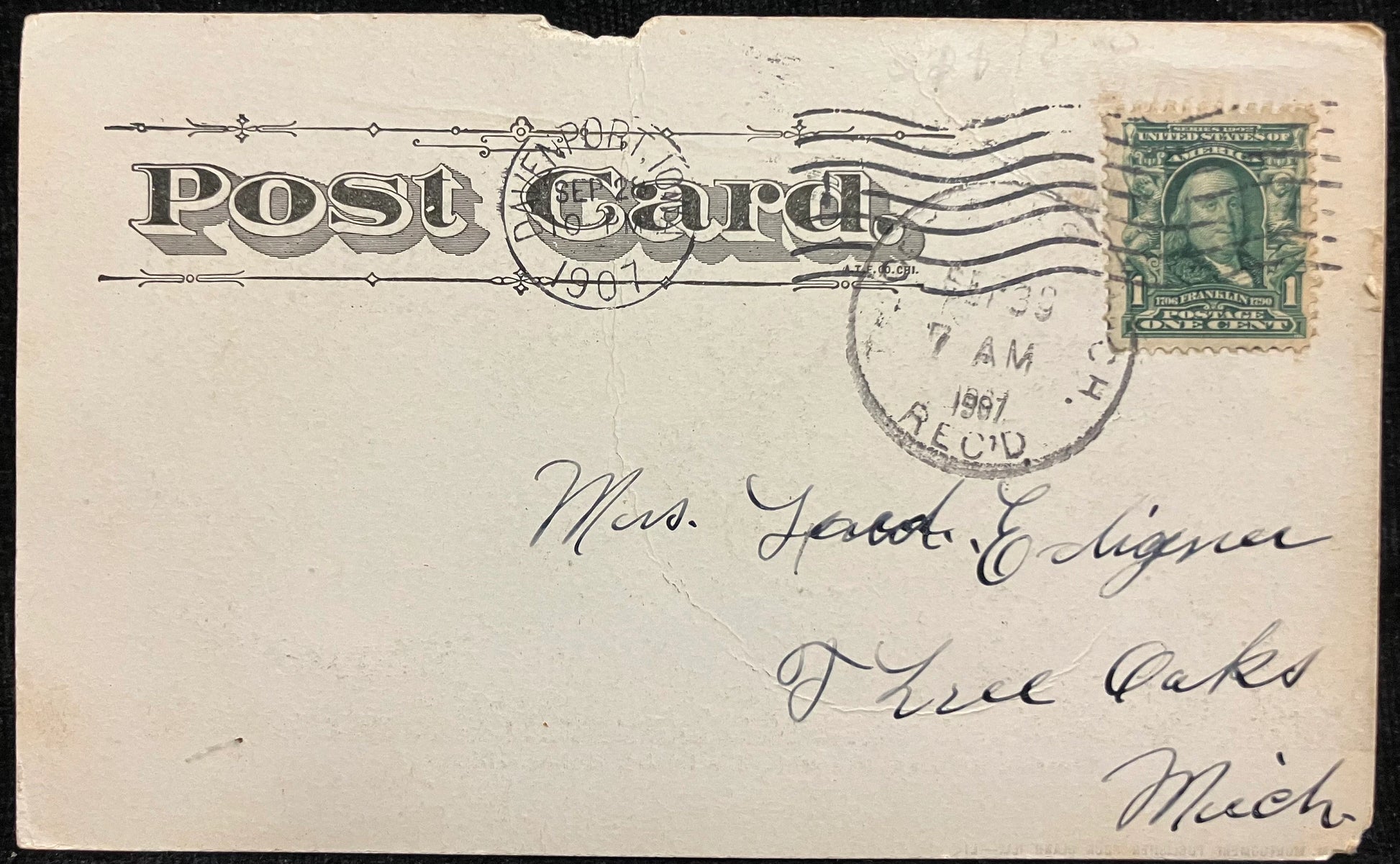 Mailed: Postmark on Sep 28, 1907 from Davenport, Iowa with a green one cent Ben Franklin stamp