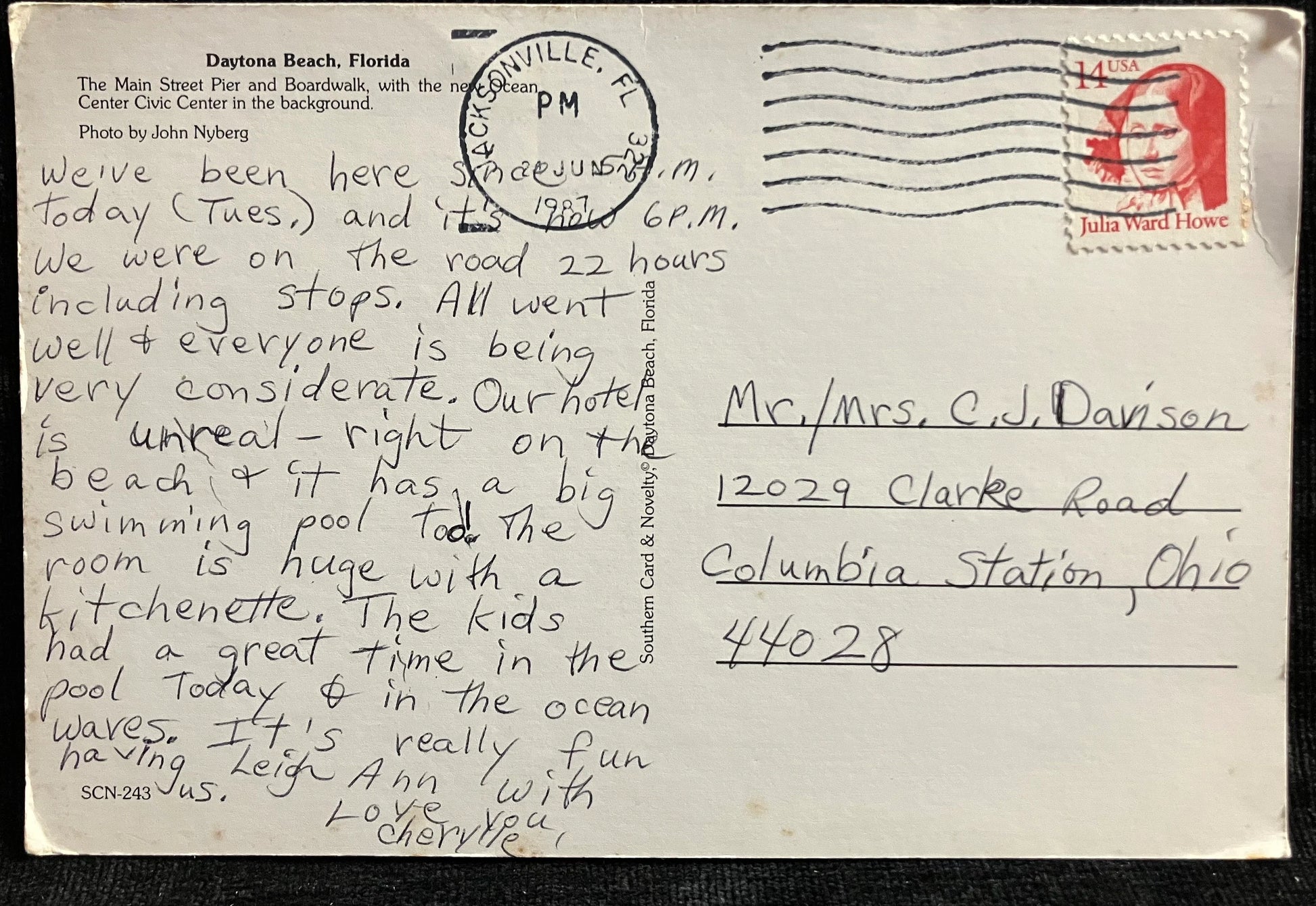 Mailed: Postmark in 1987 from Jacksonville, FL, with a red fourteen-cent Julia Ward Howe stamp