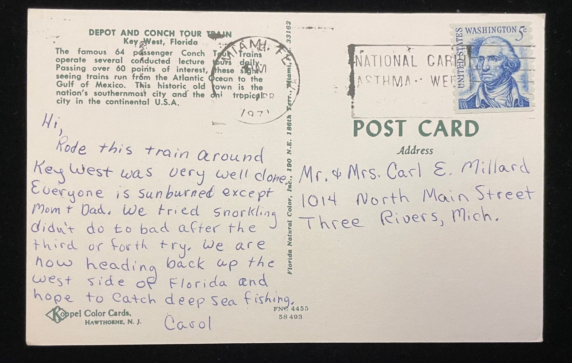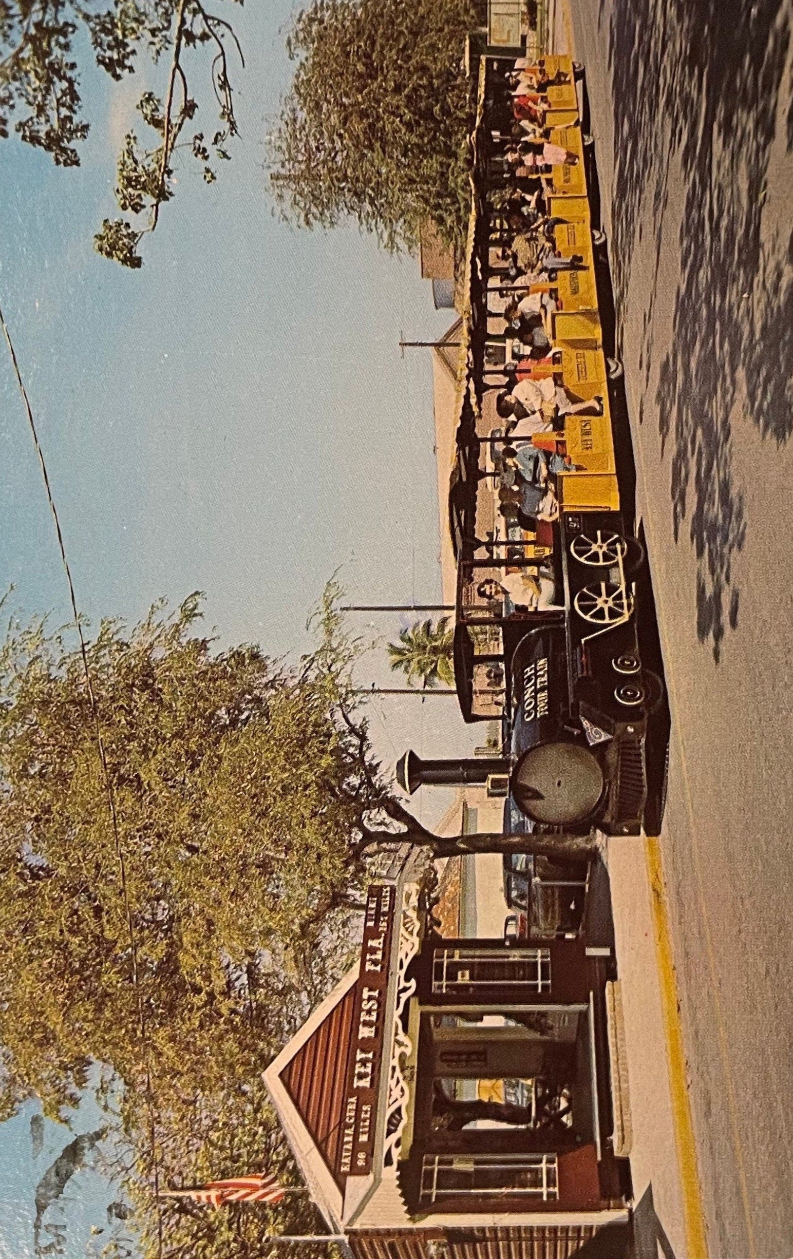 Back information - "The famous 64 passenger Conch Tour Trains operate several conducted lecture tours daily. Passing over 60 points of interest, these sightseeing trains run from Atlantic Ocean to the Gulf of Mexico. This historic old town is the nation's southernmost city and the only tropical city in the continental U.S.A."