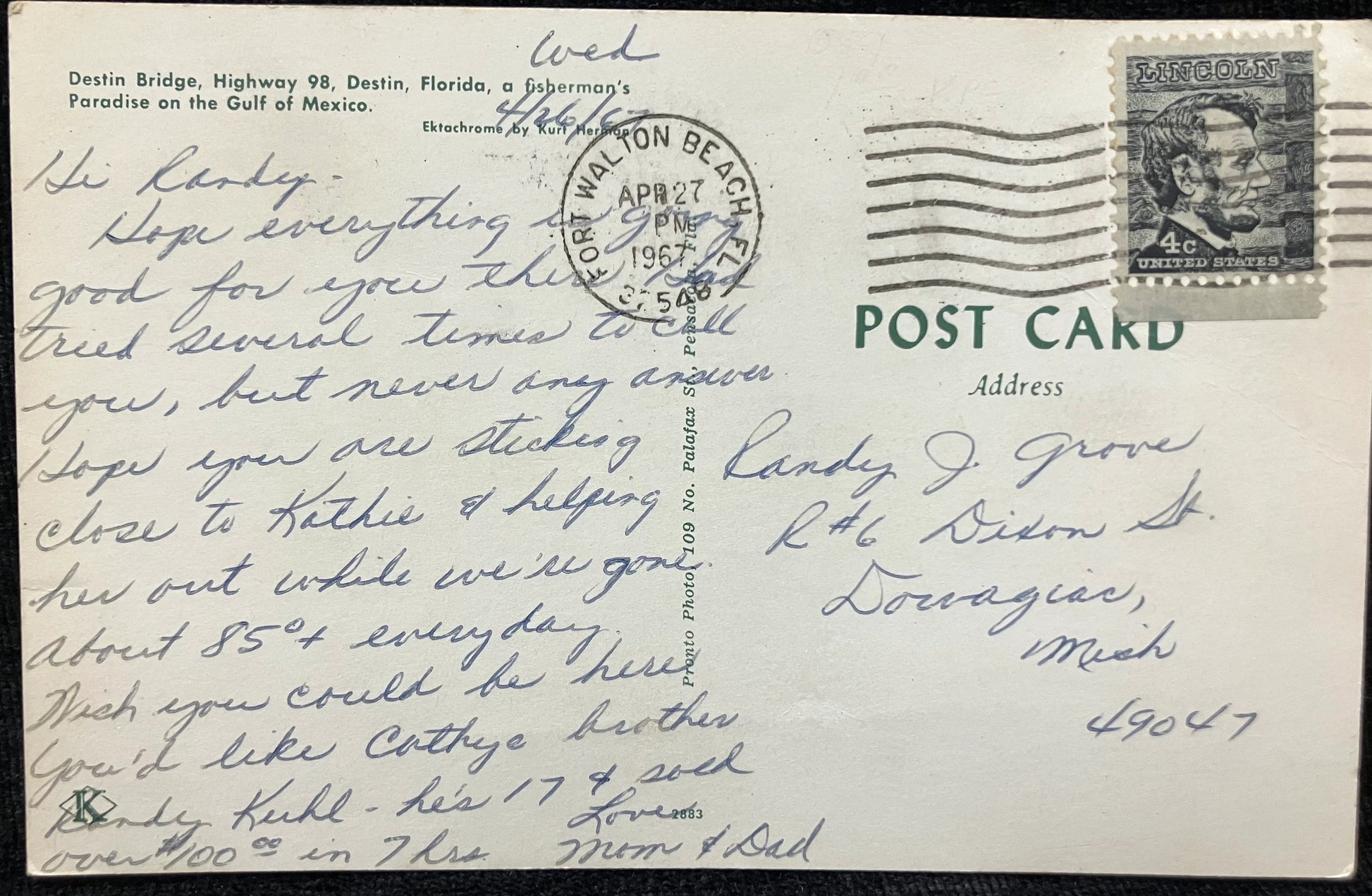 Mailed: Postmark 1967 Walton Beach, FL gray four-cent Abraham Lincoln stamp