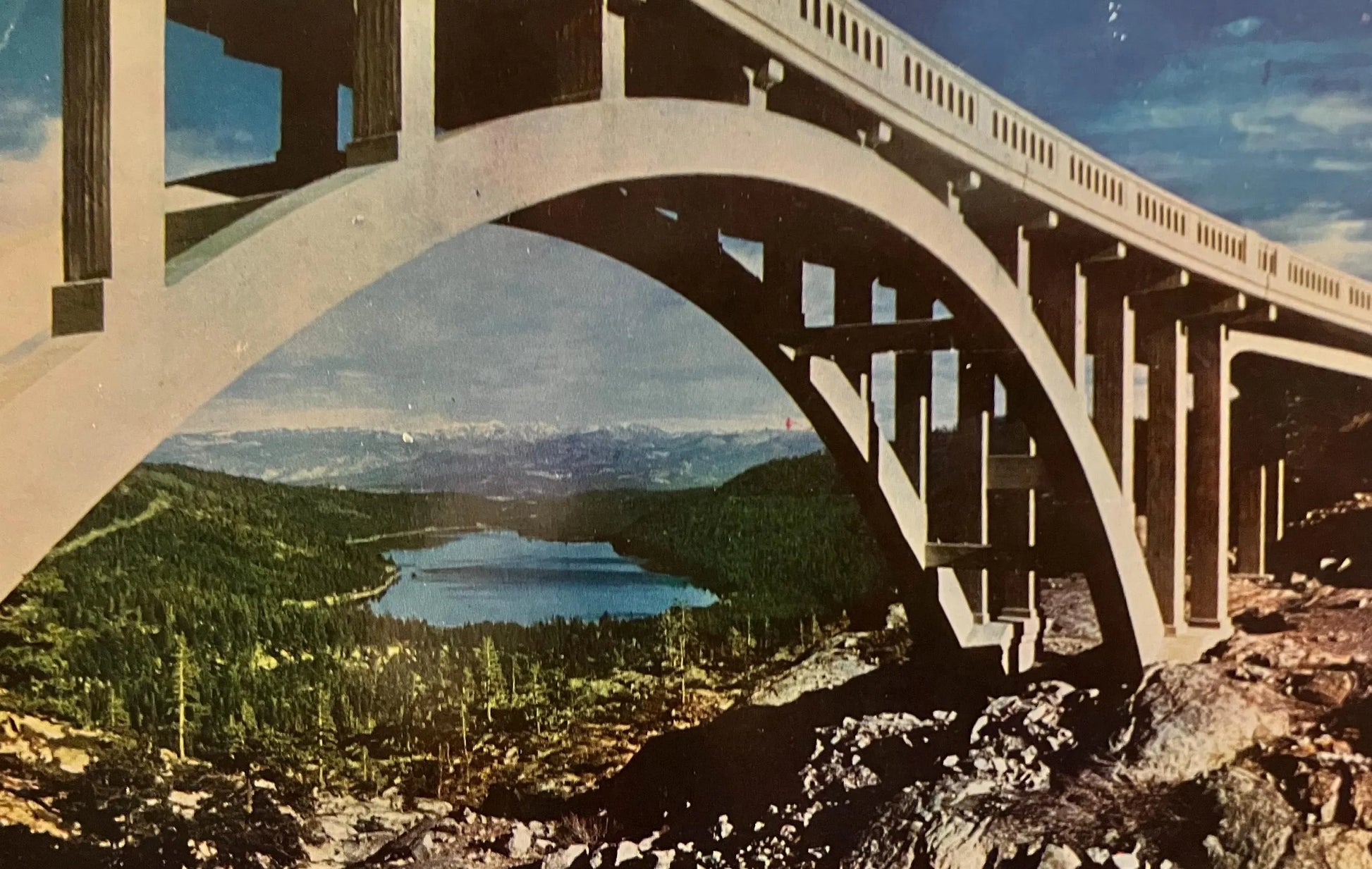 Back: Donner Lake This beautiful alpine lake lies in a glacial hollow in the Sierra Nevadas surrounded by glorious scenery. Pioneer monument to the east end of the lake stands where the ill-fated Donner Party of gold-rush days were snow bound.