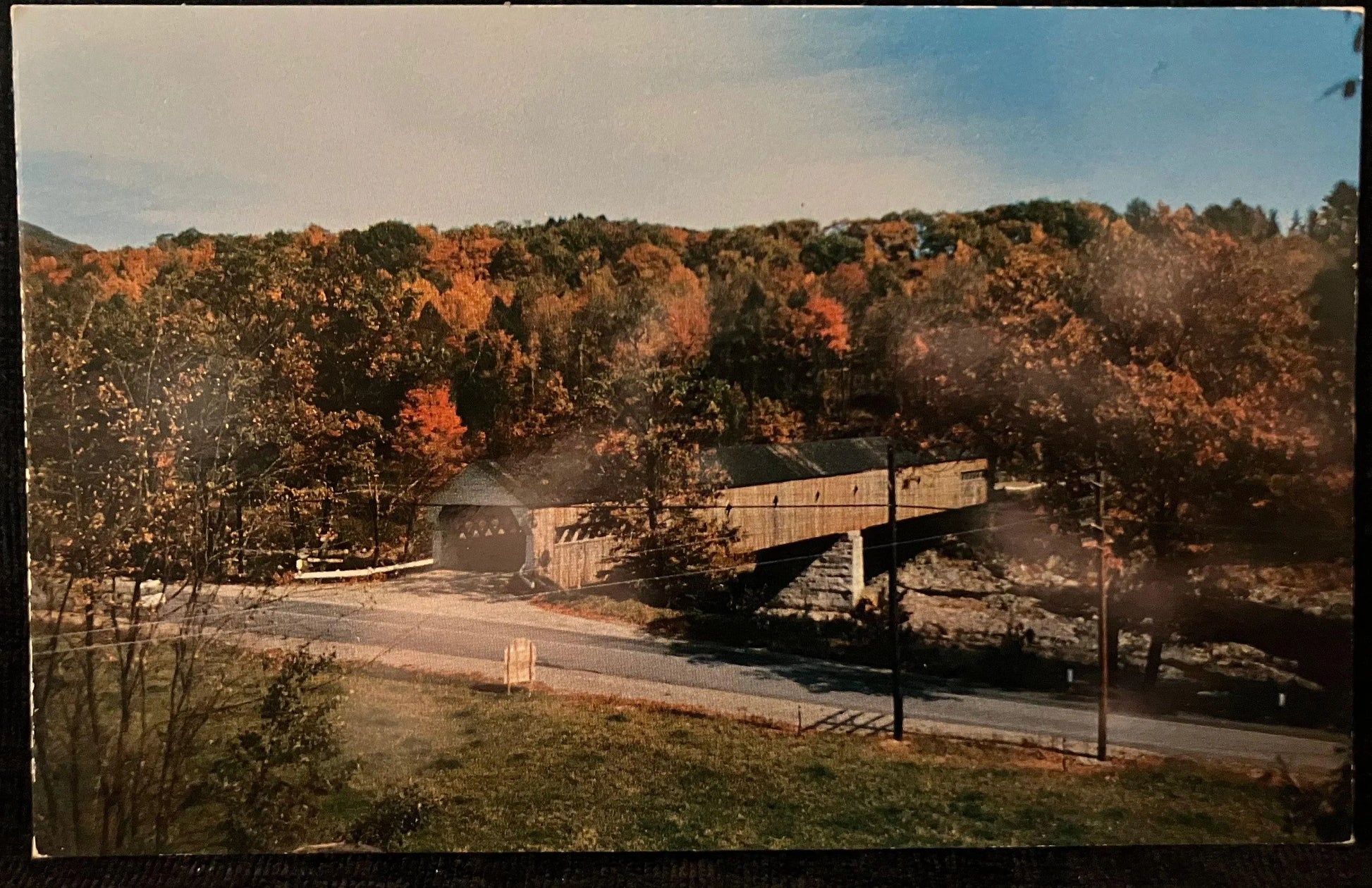Back: Covered Bridge over West River at West Dummerston, Vermont, on Route 30.