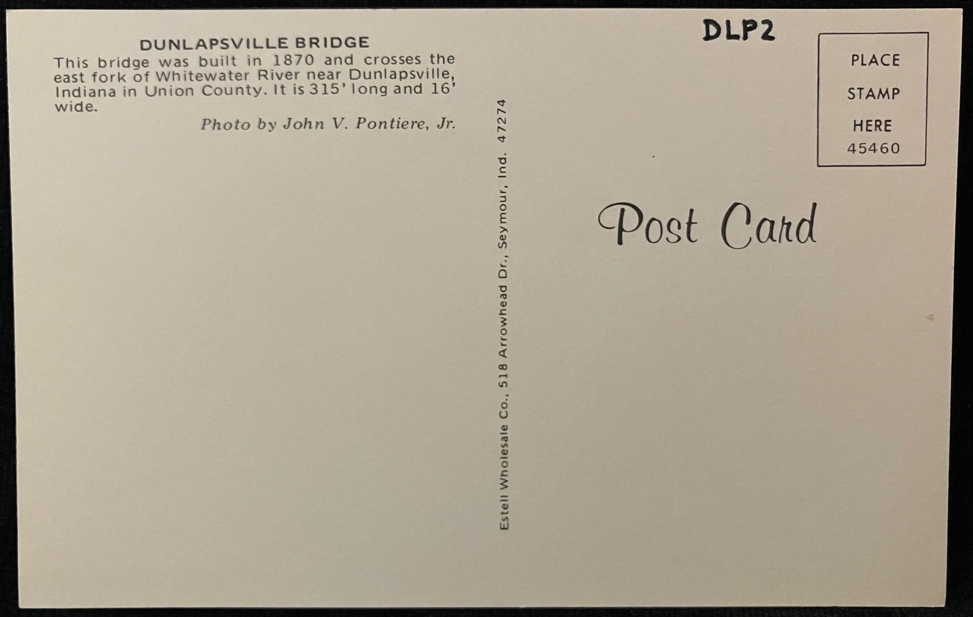 On back: DUNLAPSVILLE BRIDGE This bridge was built in 1870 and crosses the east fork of Whitewater River near Dunlapsville, Indiana in Union County. It is 315' long and 16' wide.