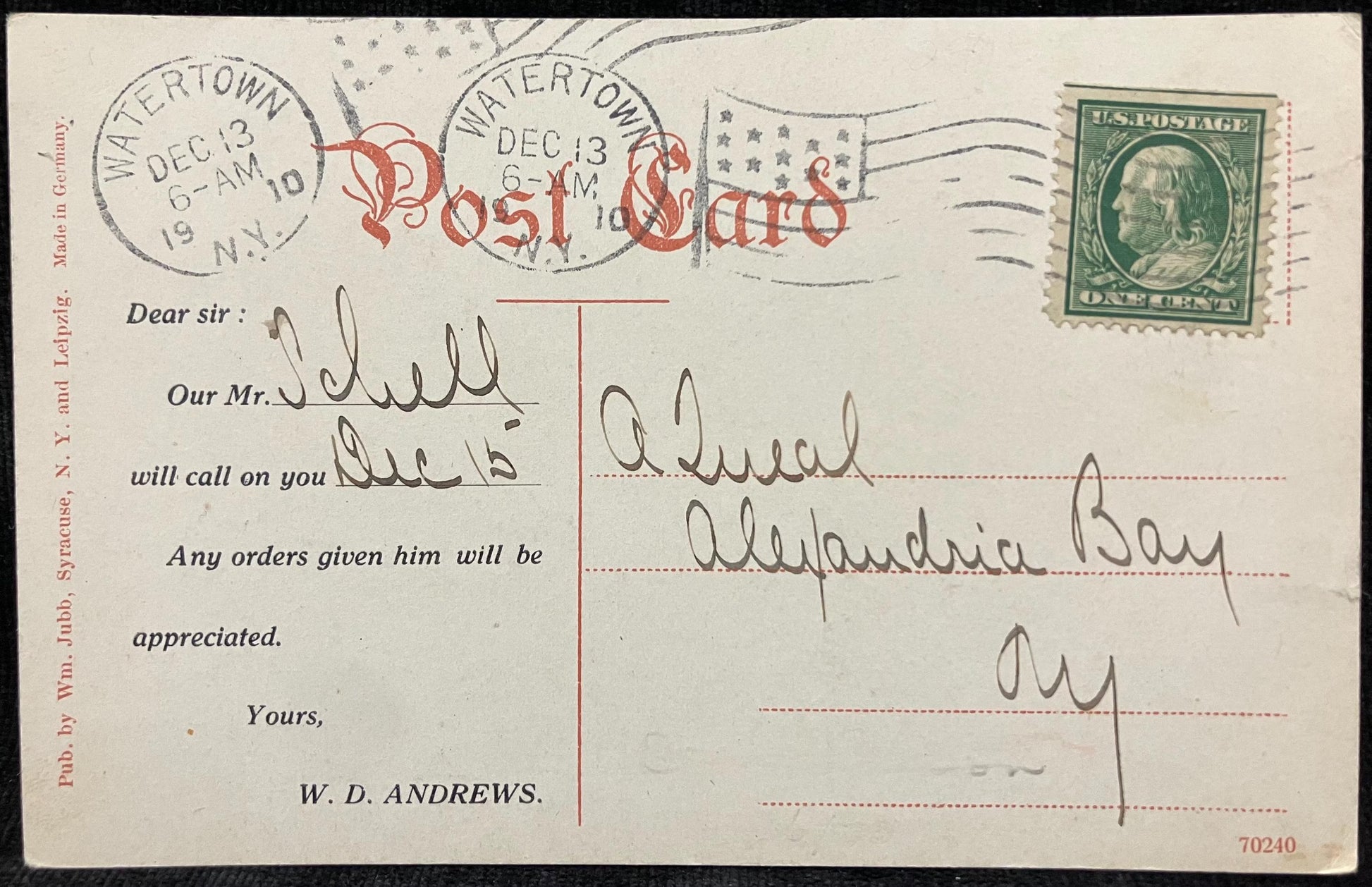 Mailed: Postmark: 1910 green one cent Benjamin Franklin stamp