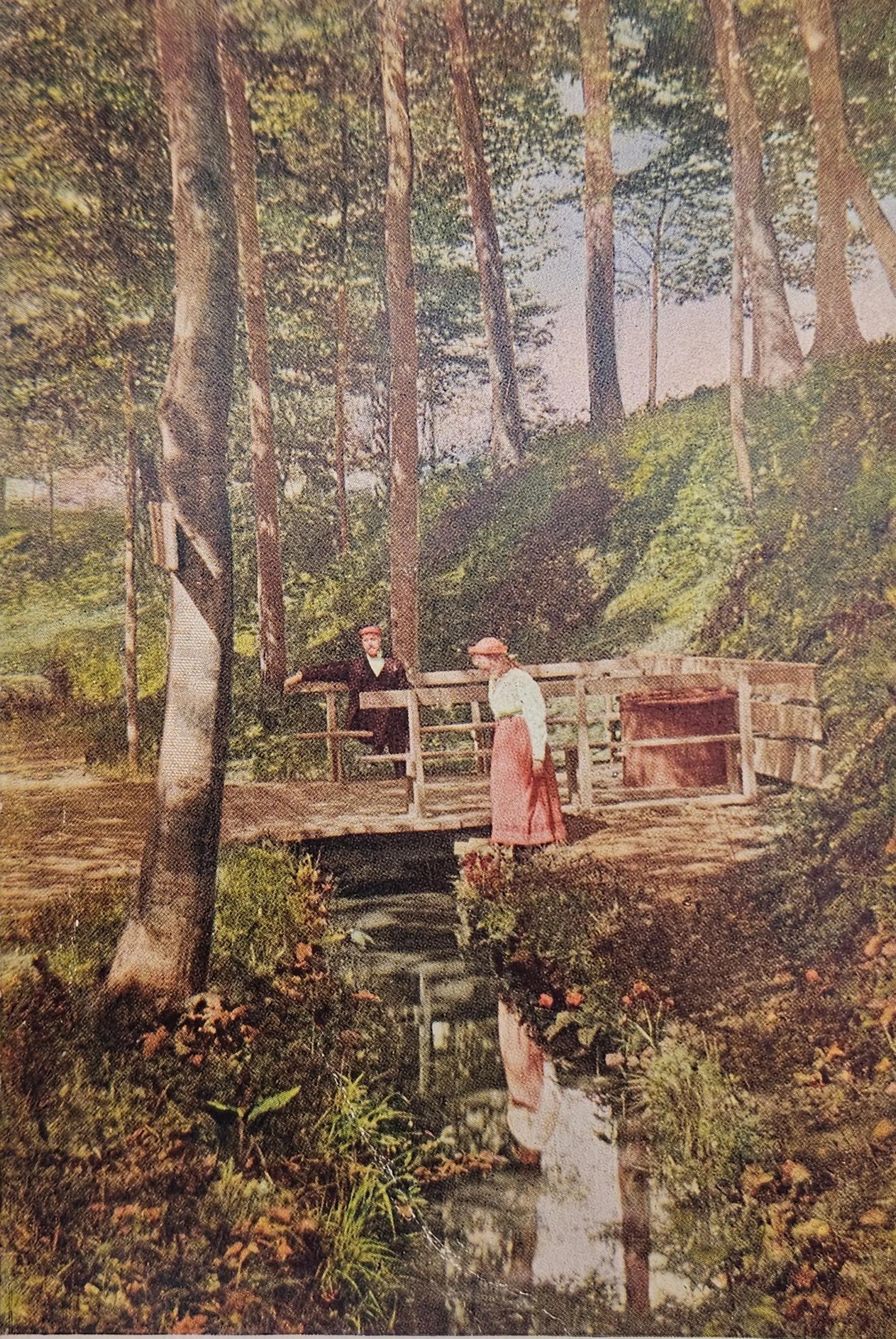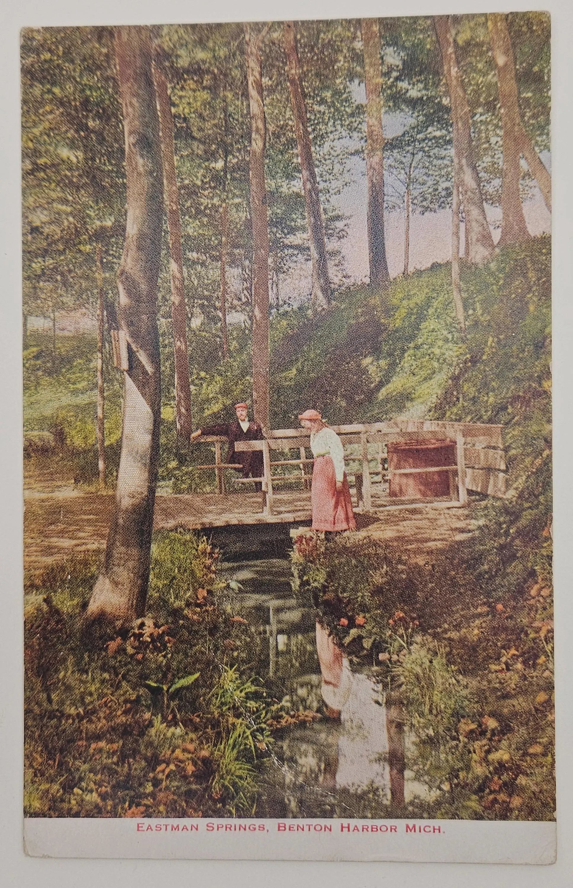 Front: Eastman Springs, where a man and a woman stand on a bridge over the creek, Benton Harbor, Michigan