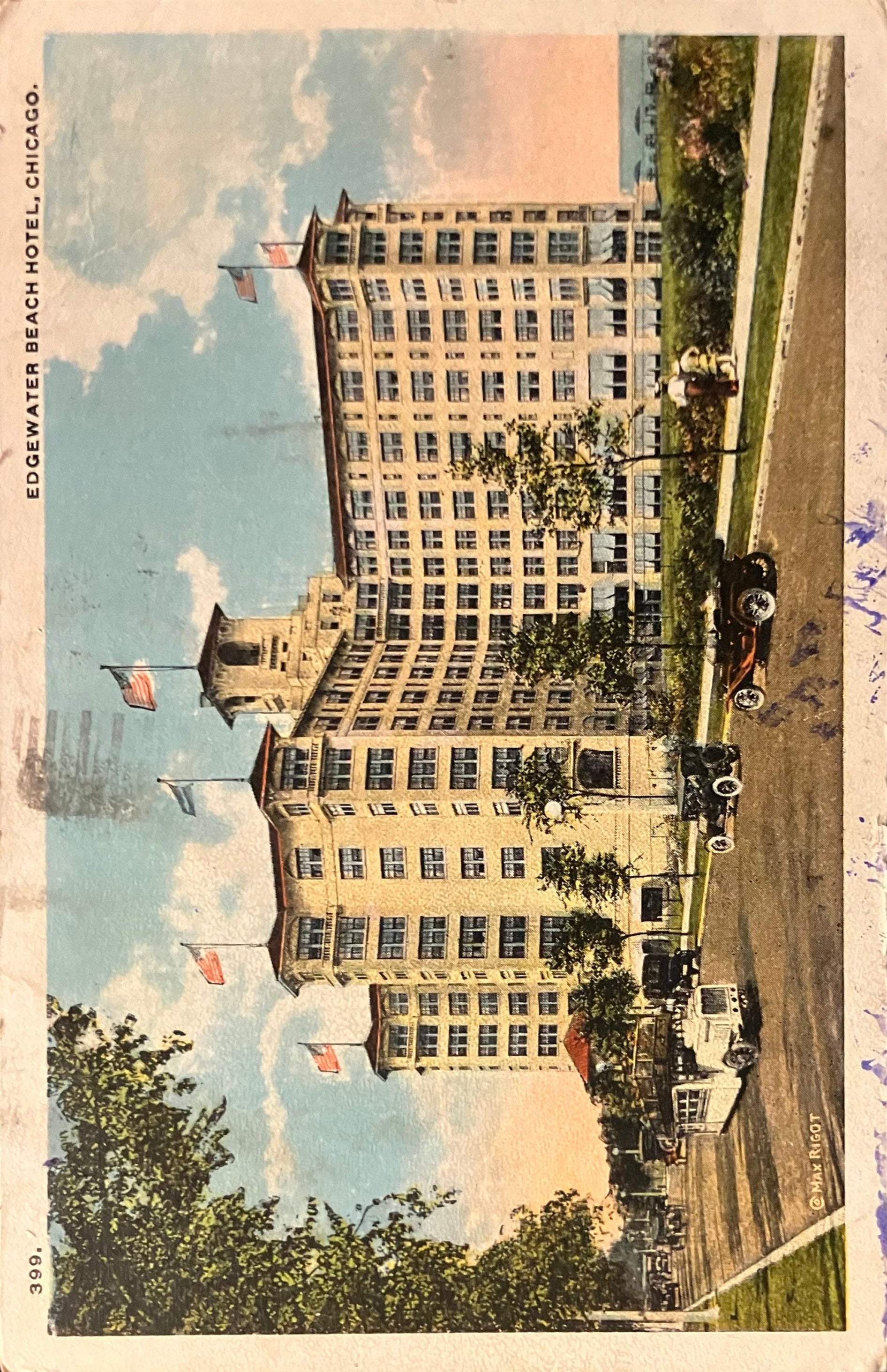 On back: The Edgewater Hotel is located about 7 miles from the center of the city. It is on North Sore Drive and built in the shape of a Greek Cross without the central Court. ( card has a handwritten message on back)