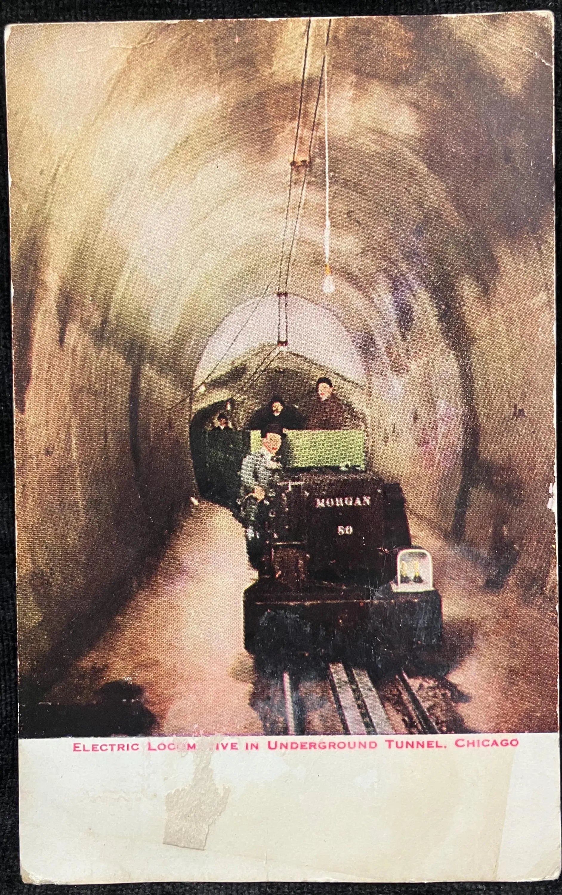 Front: Electric Locomotive in Underground Tunnel, Chicago.