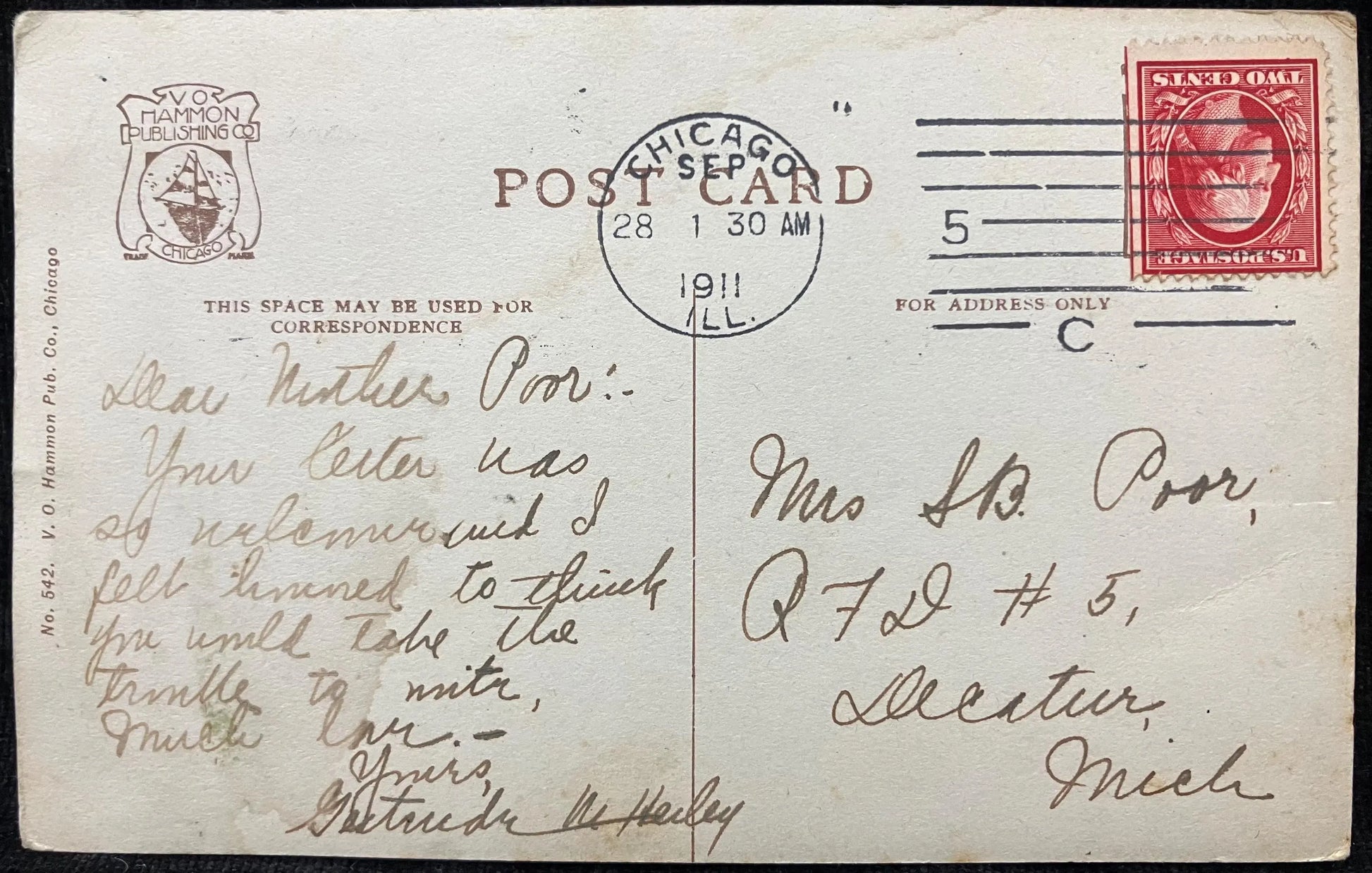 Mailed: Postmark: 1911 red, upsidedown placed, George Washington stamp