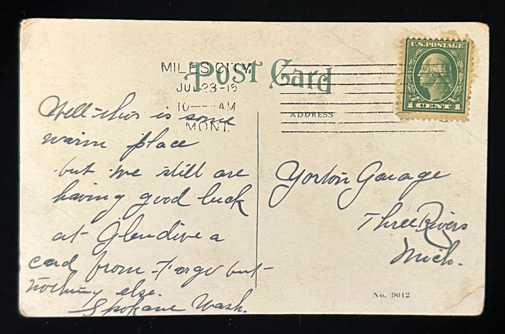 Mailed- Posted on July 23rd, 1915, from Miles City, Montana, with a green 1-cent George Washington stamp