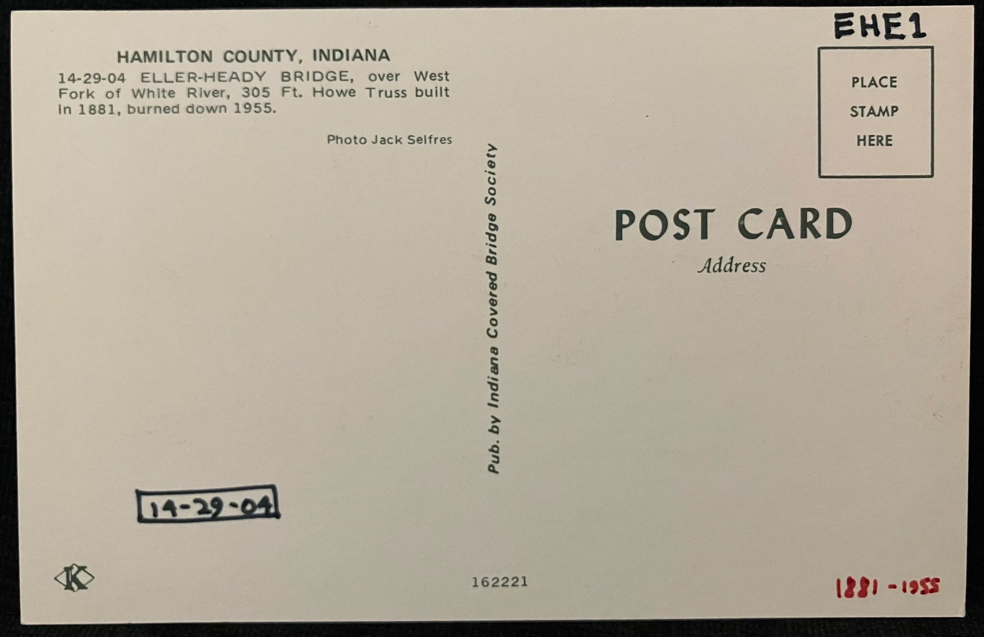 On back: HAMILTON COUNTY, INDIANA 24-29-04 ELLER-HEADY BRIDGE, over West Fork of White River, 305 Ft. Howe Truss built in 1881, burned down 1955.