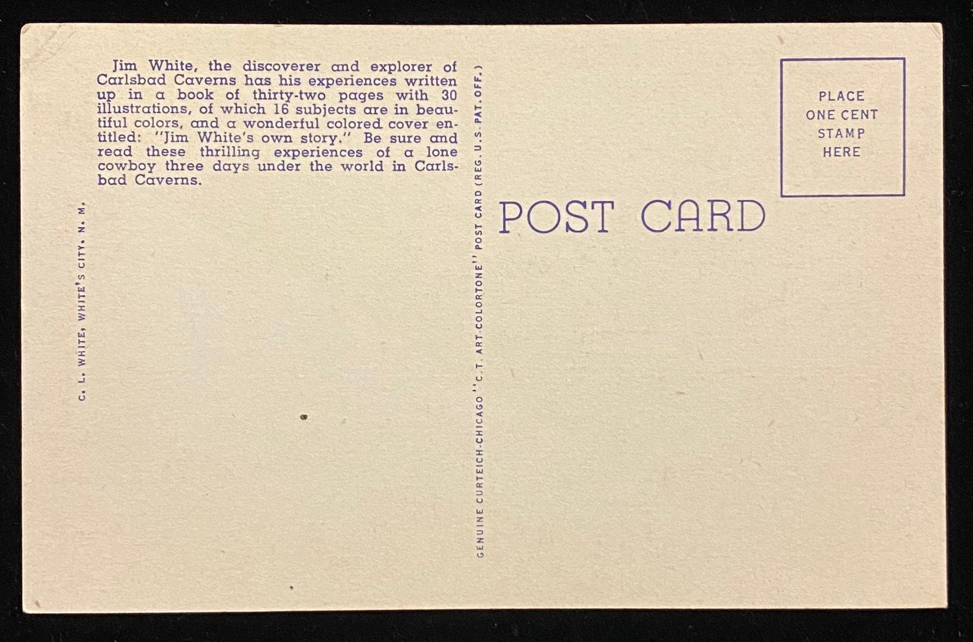 Back Information: Jim White, the discoverer and explorer of Carlsbad Caverns has his experiences written up in a book of thirty-two pages with 30 illustrations, of which 16 subjects are in beautiful colors, and a wonderful colored cover entitled: 'Jim White's own story.' Be sure and read these thrilling experiences of a lone cowboy three days under the world in Carlsbad Caverns."