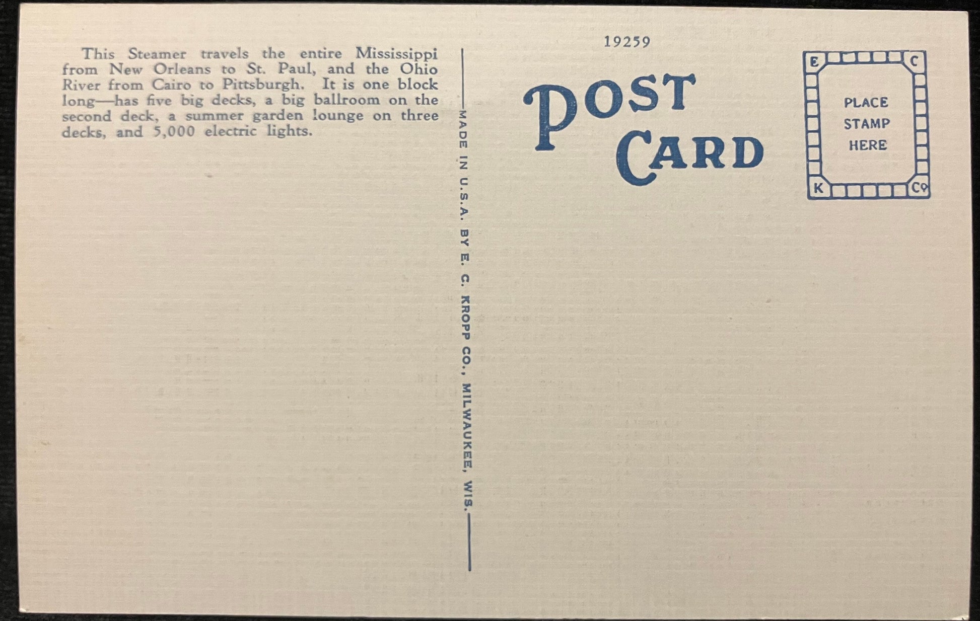 On back: Steamer travels the entire Mississippi from New Orleans to St. Paul, and the Ohio River from Cairo to Pittsburgh. It is one block long - has five big decks, a big ballroom on the second deck, a summer garden lounge on three decks, and 5,000 electric lights.
