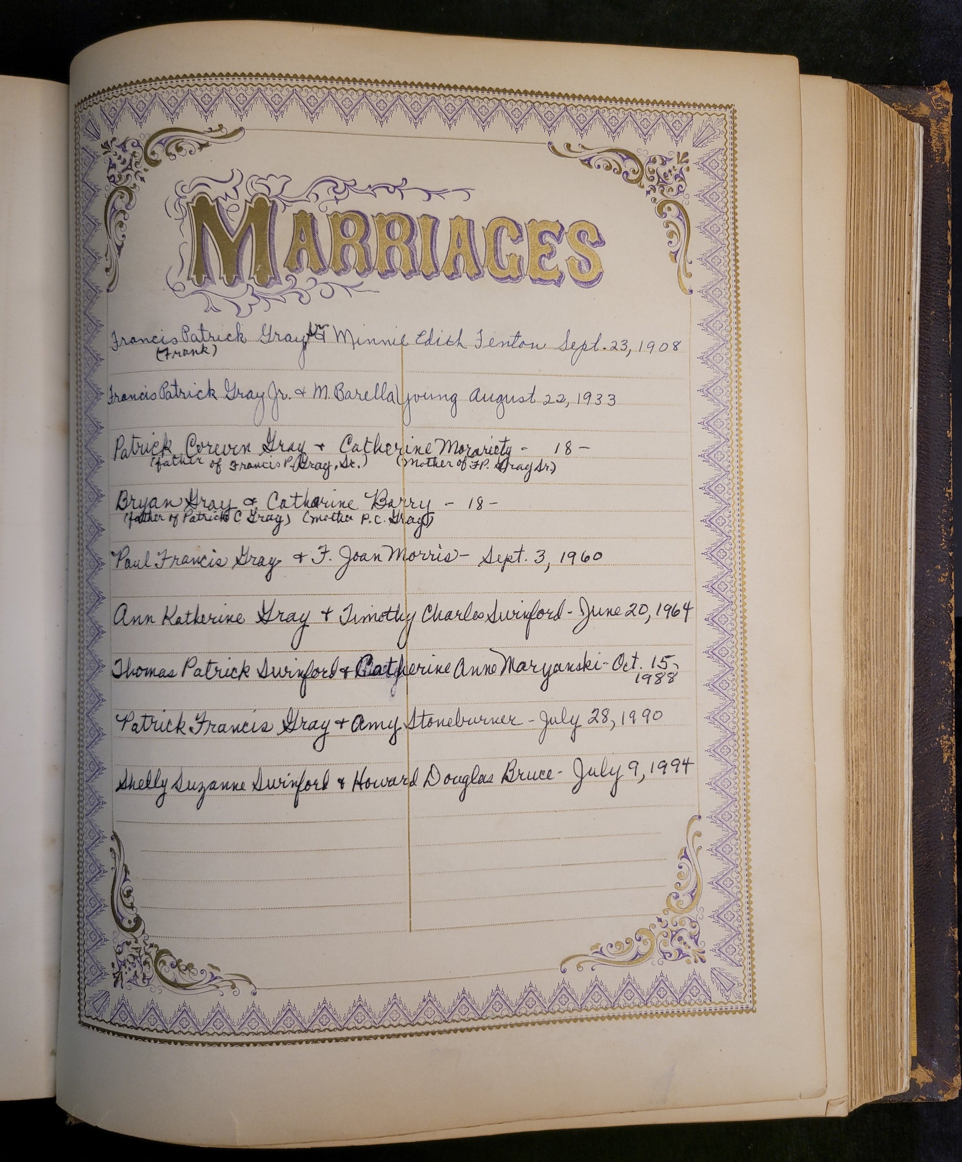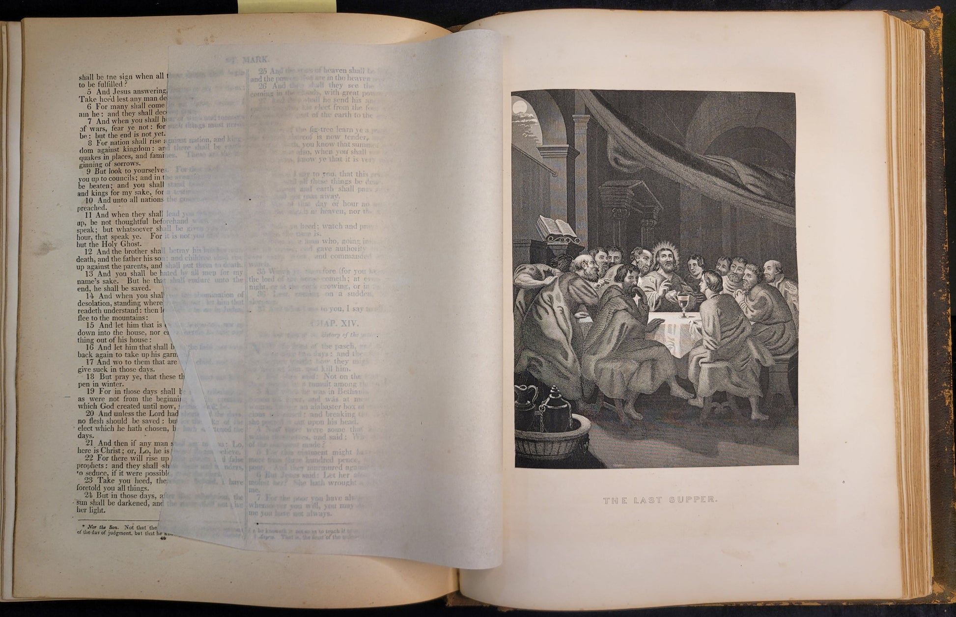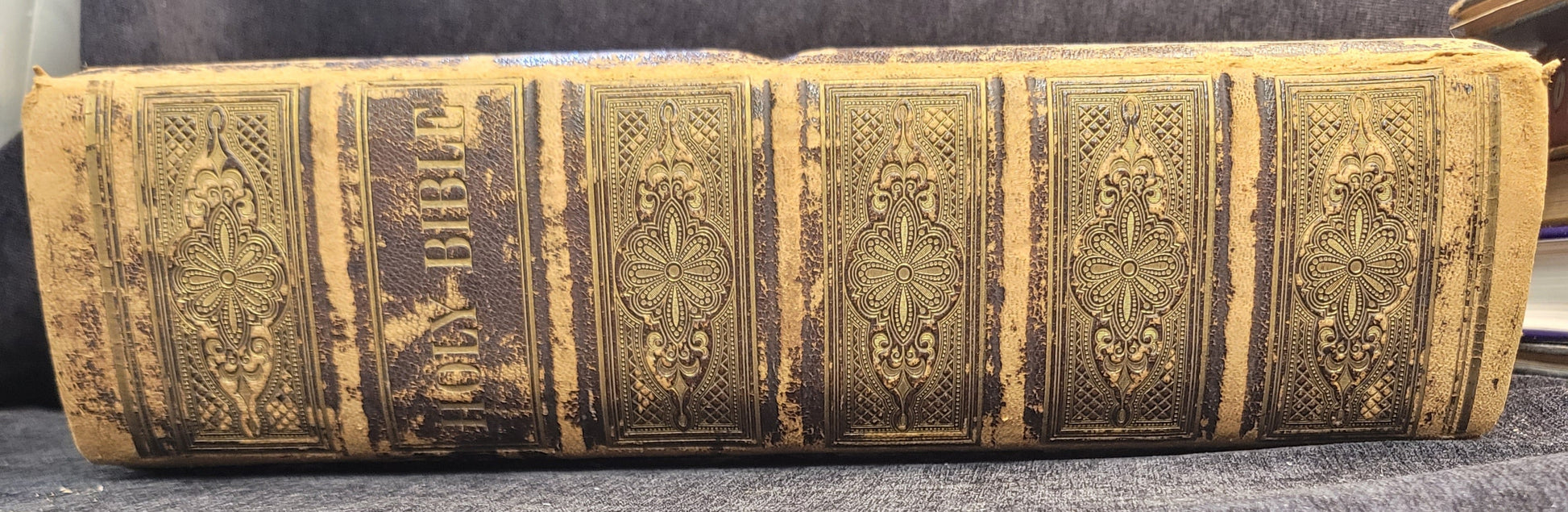 This mid 19th-century family bible is in extraordinary condition for its age. The lambskin cover has typical wear on raised surfaces and corners and gold stamping on the binding. There are many full page engravings of scenes from the scripture. The gilded edges still shine and the pages are in excellent shape. There are a few stains throughout. This bible was in the possession of the Gray-Swinford family. There is a record of marriages, births, and deaths between old and new testaments.