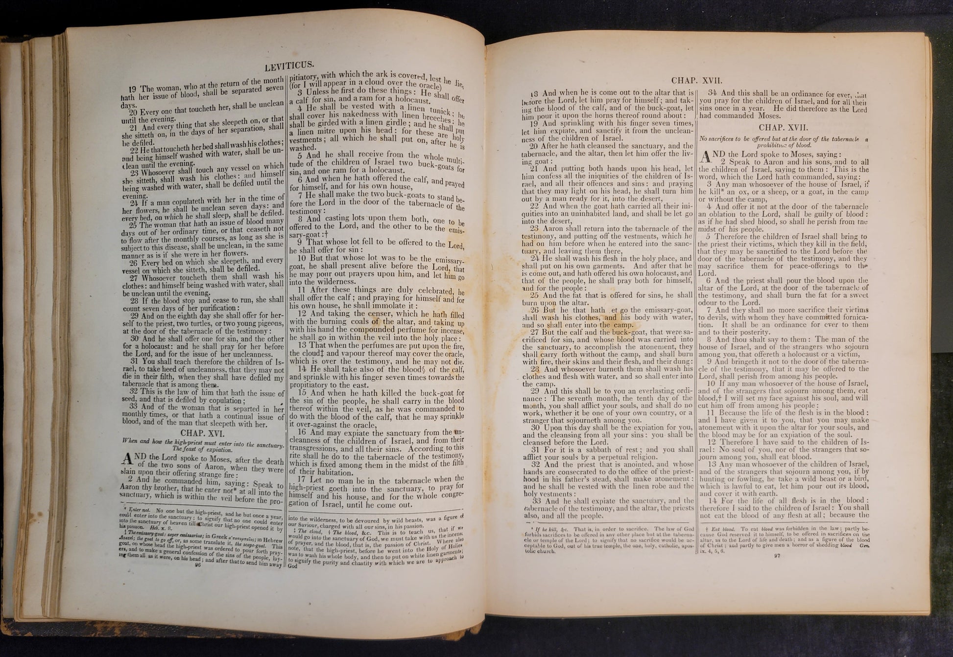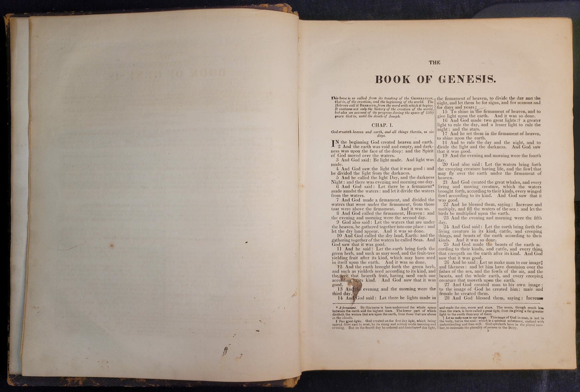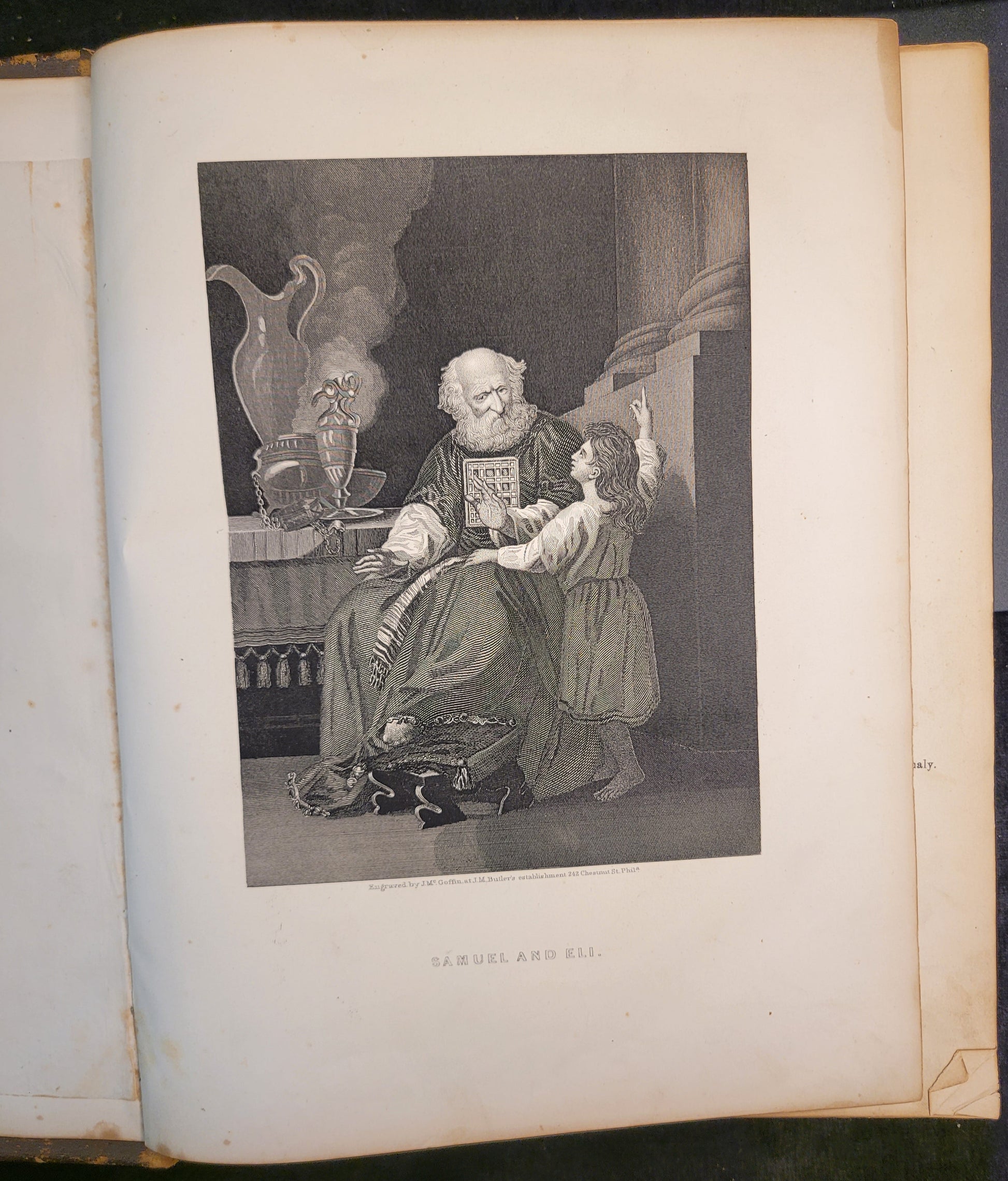 This mid 19th-century family bible is in extraordinary condition for its age. The lambskin cover has typical wear on raised surfaces and corners and gold stamping on the binding. There are many full page engravings of scenes from the scripture. The gilded edges still shine and the pages are in excellent shape. There are a few stains throughout. This bible was in the possession of the Gray-Swinford family. There is a record of marriages, births, and deaths between old and new testaments.