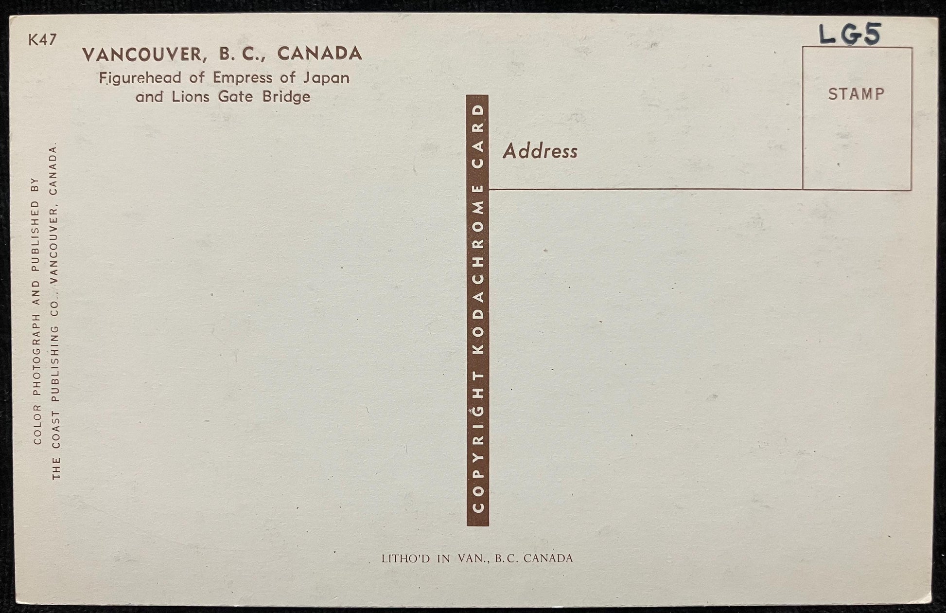 Front: Figure of the Empress of Japan and Lions Gate Bridge