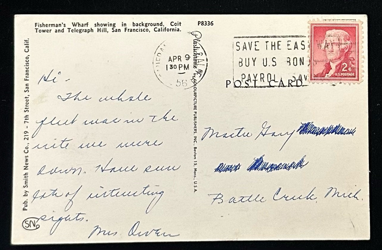 Mailed: Posted in April 9th, 1956 from Fisherman's Wharf, California with a Carmine 2 cent Jefferson stamp.