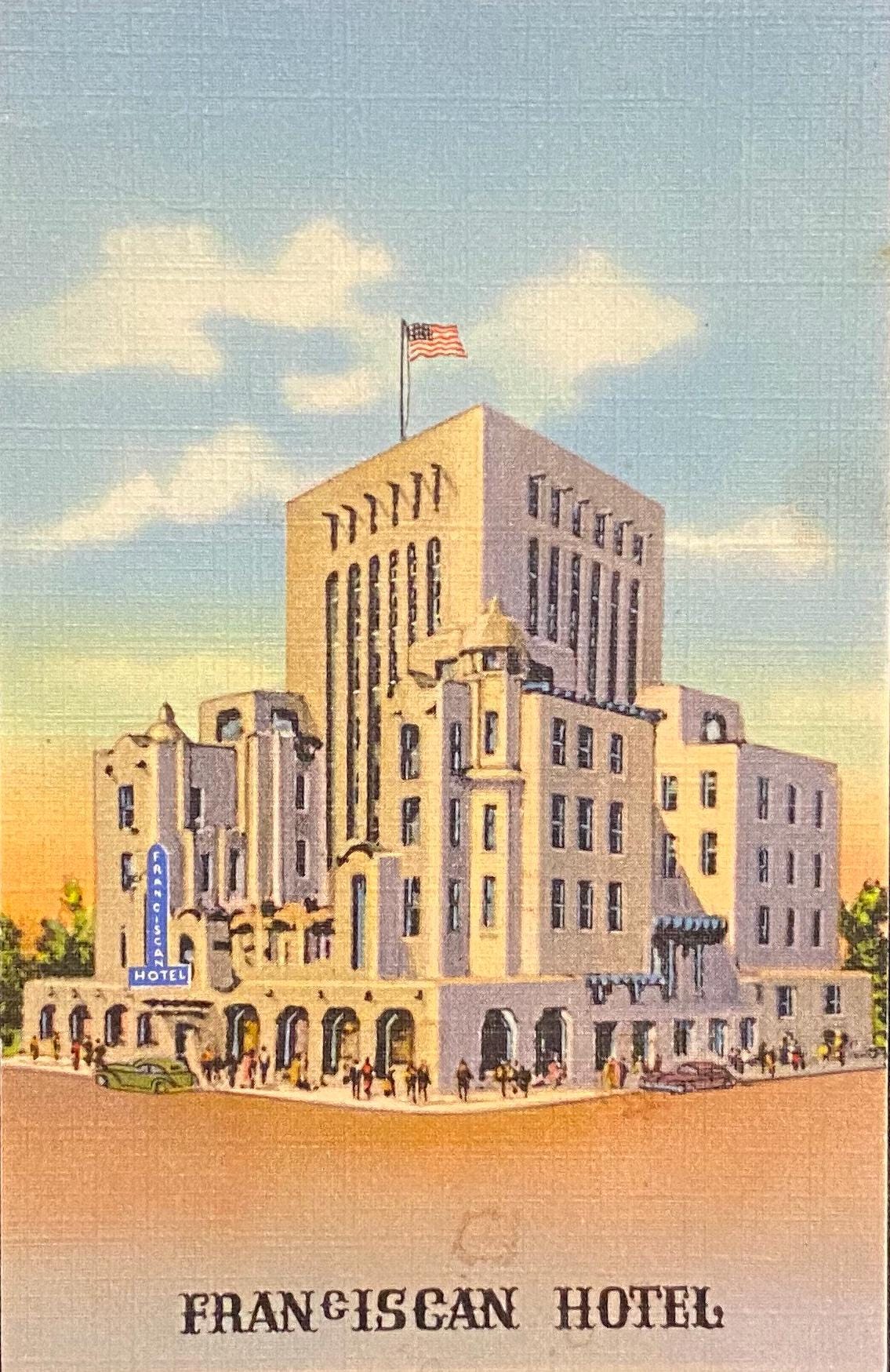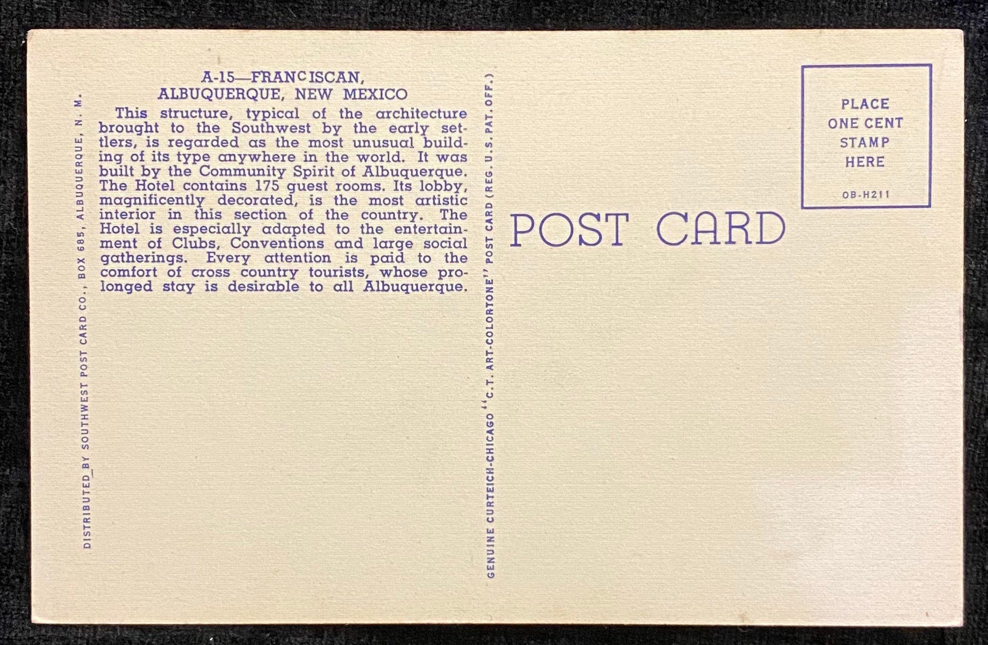 Back: Franciscan, Albuquerque, New Mexico | "This structure, typical of the architecture brought to the Southwest by the early settlers, is regarded as the most unusual building of its type anywhere in the world. It was built by the Community Spirit of Albuquerque. The Hotel contains 175 guest rooms. Its lobby, magnificently decorated, is the most artistic interior in this section of the country. The Hotel is especially adapted to the entertainment of Clubs, Conventions and large social gatherings. Every attention is paid to the comfort of cross country tourists, whose prolonged stay is desirable to all Albuquerque."