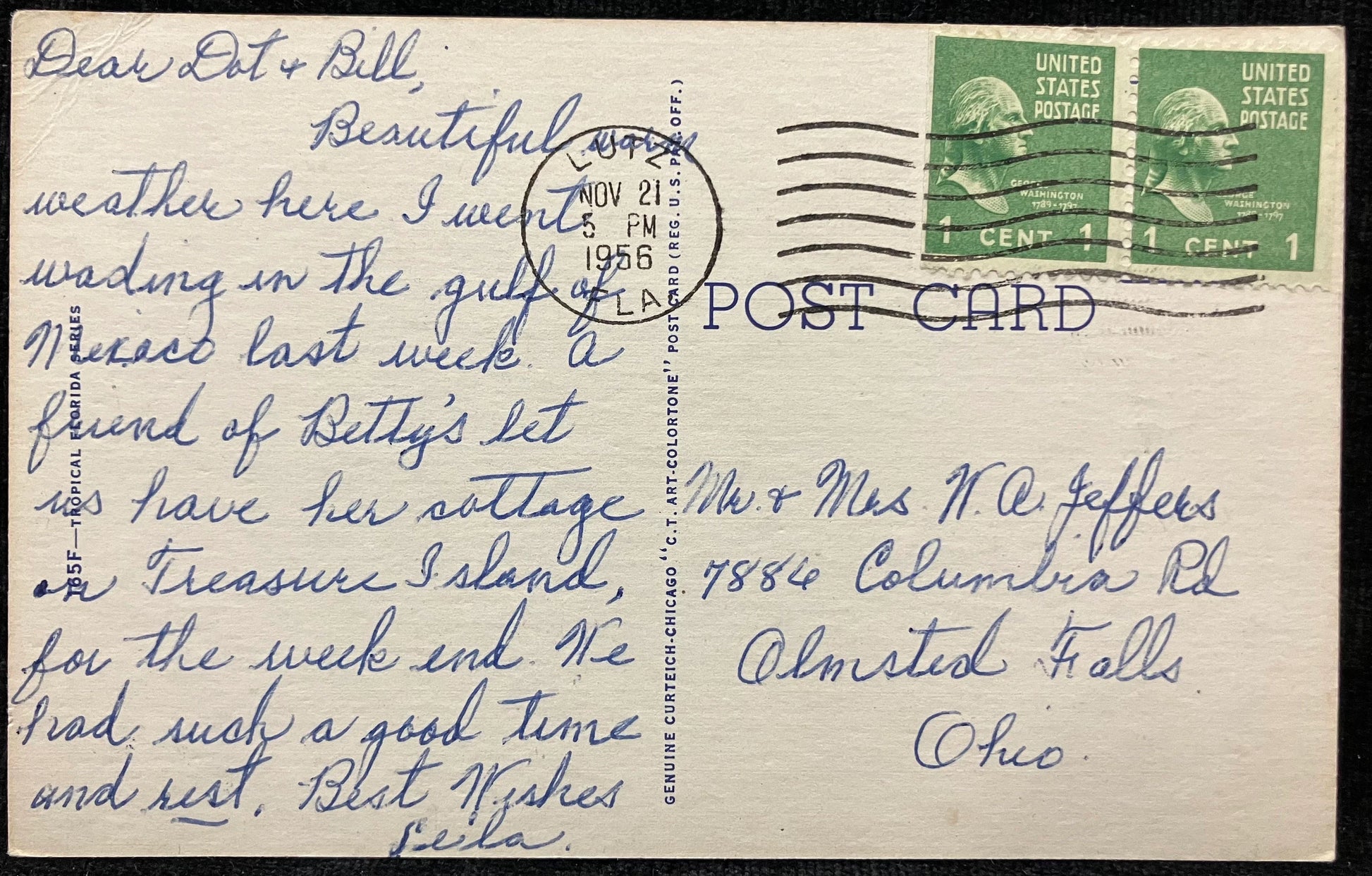 Mailed: Postmark on Nov. 21, 1956 from Lutz, Fla. with two green one cent George Washington stamps