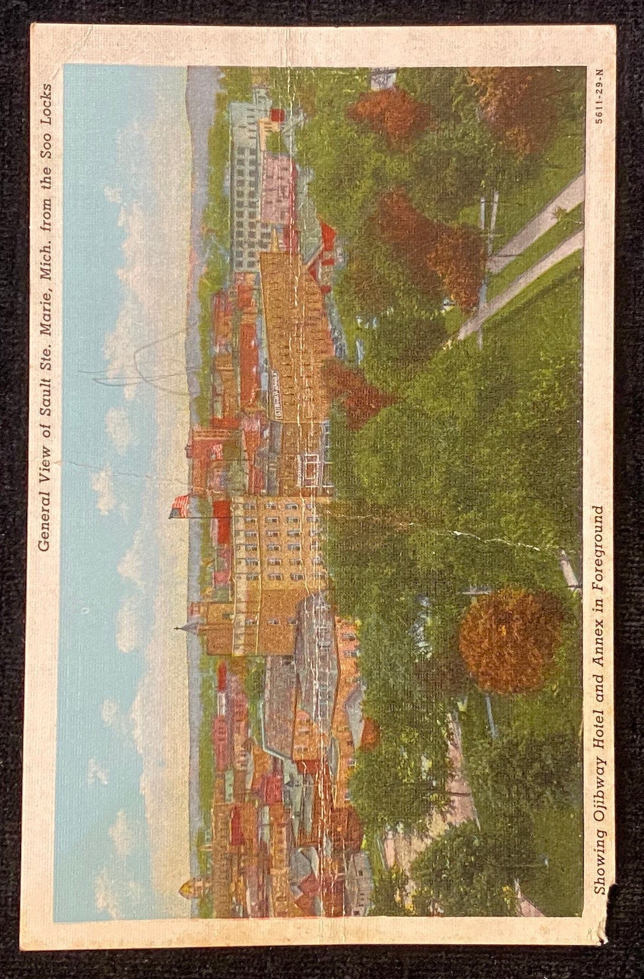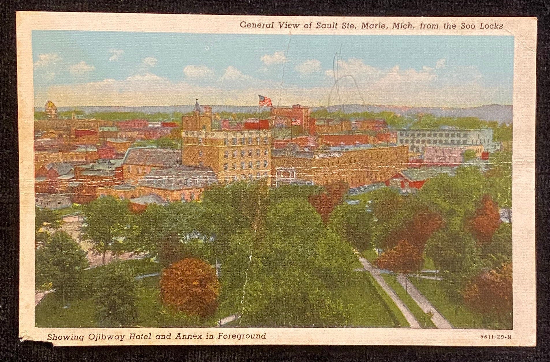 Front: General View of Sault Ste. Marie, Mich. from the Soo Locks | Showing Ojibway hotel and Annex in foreground