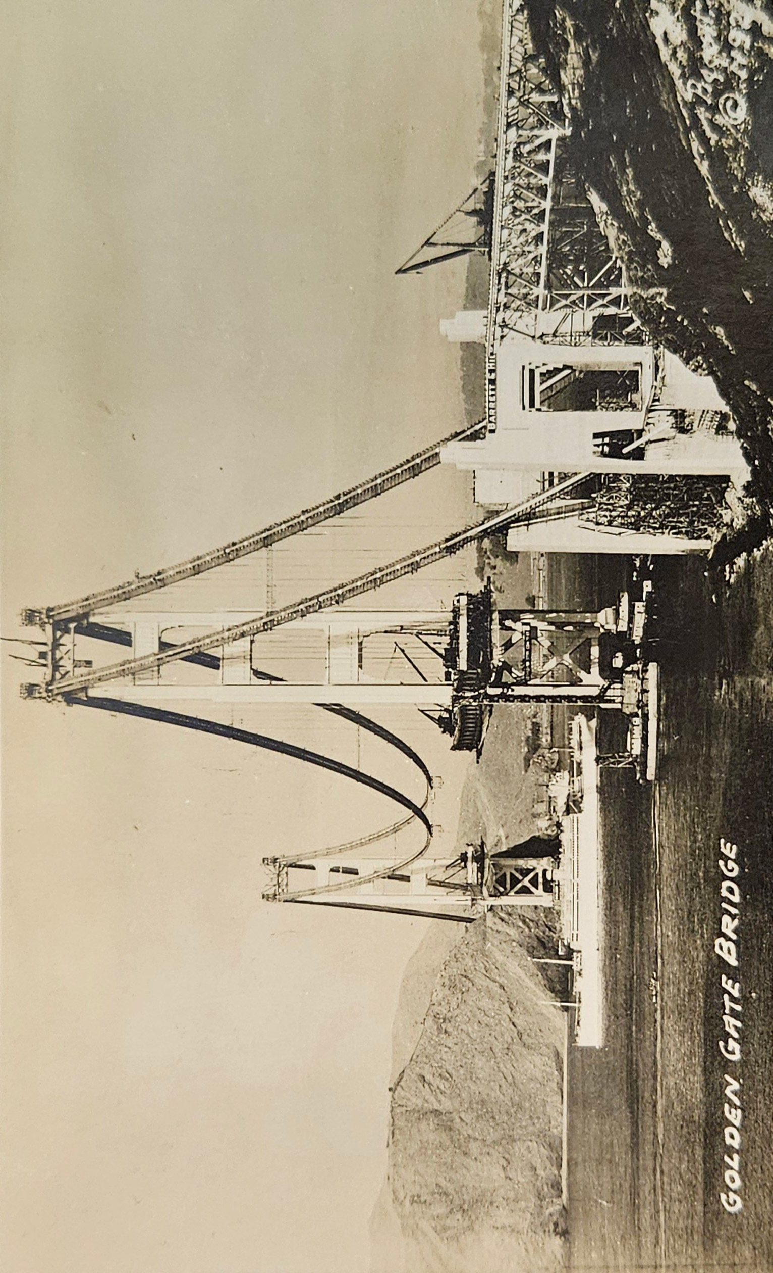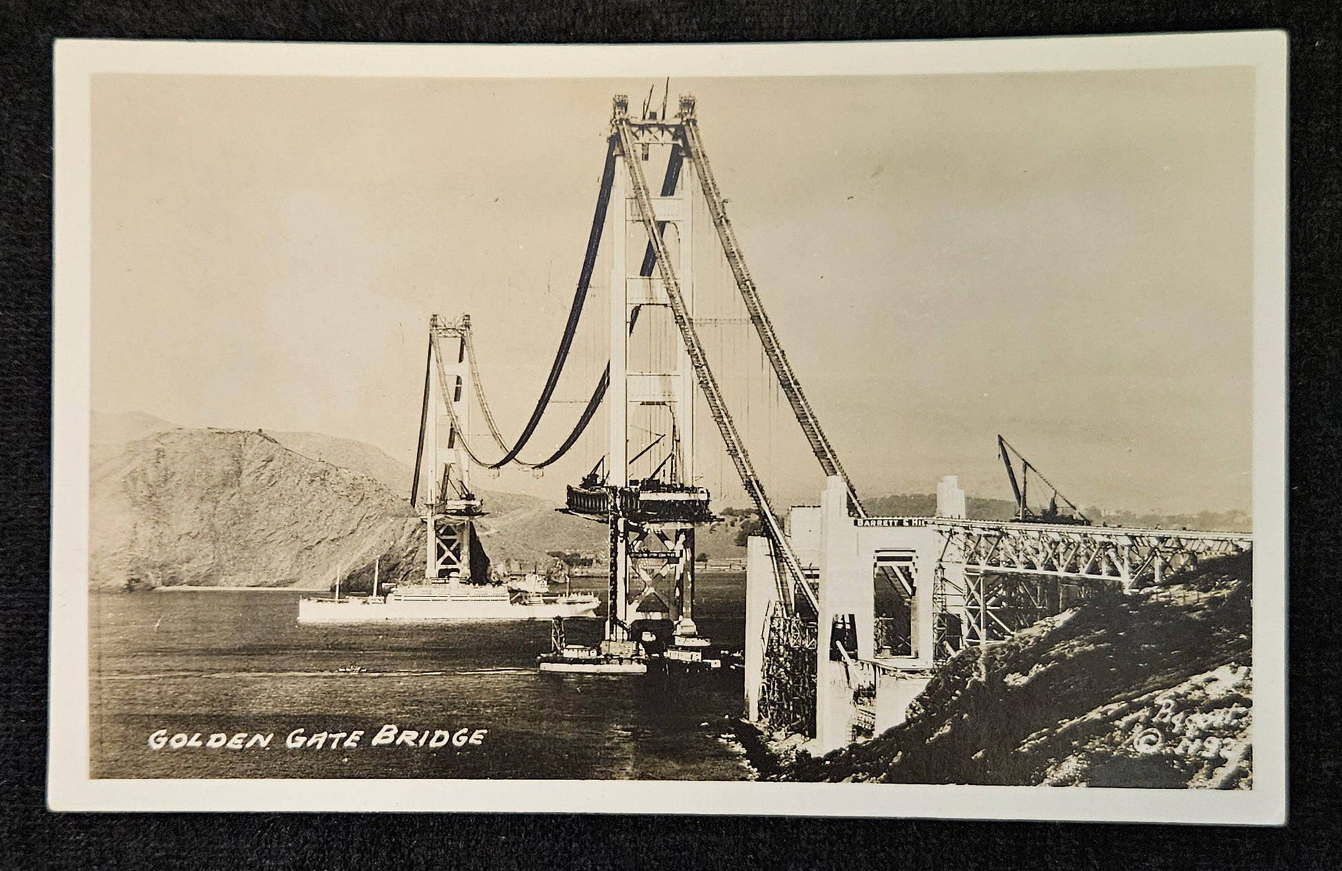 RPPC - Golden Gate Bridge Under Construction - 1935 Postcard Black/ White Photo - Bridge Construction Photo - Naval Ship Passing under Bridge