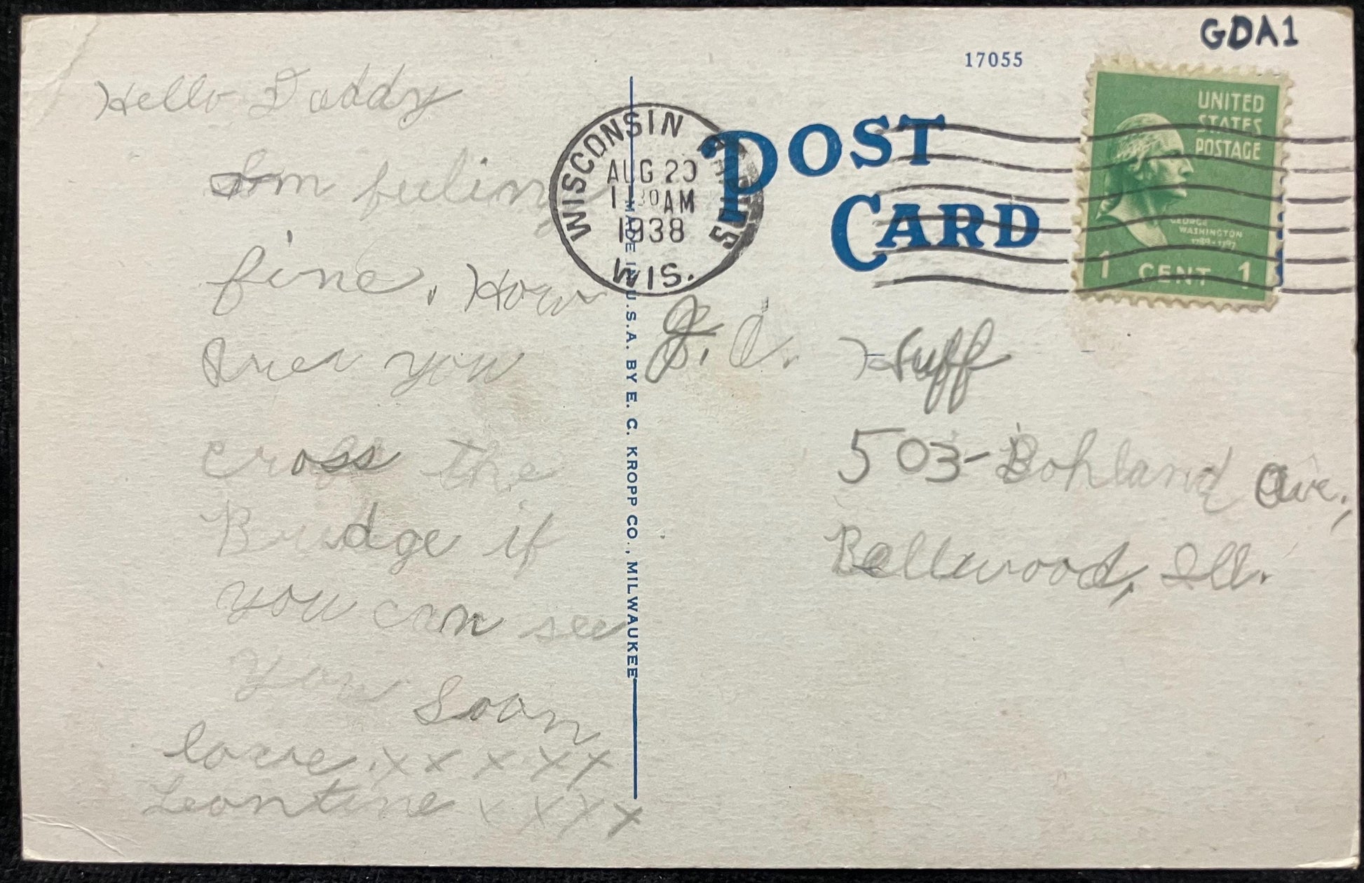 Mailed: Postmark: 1938 green one cent George Washington stamp