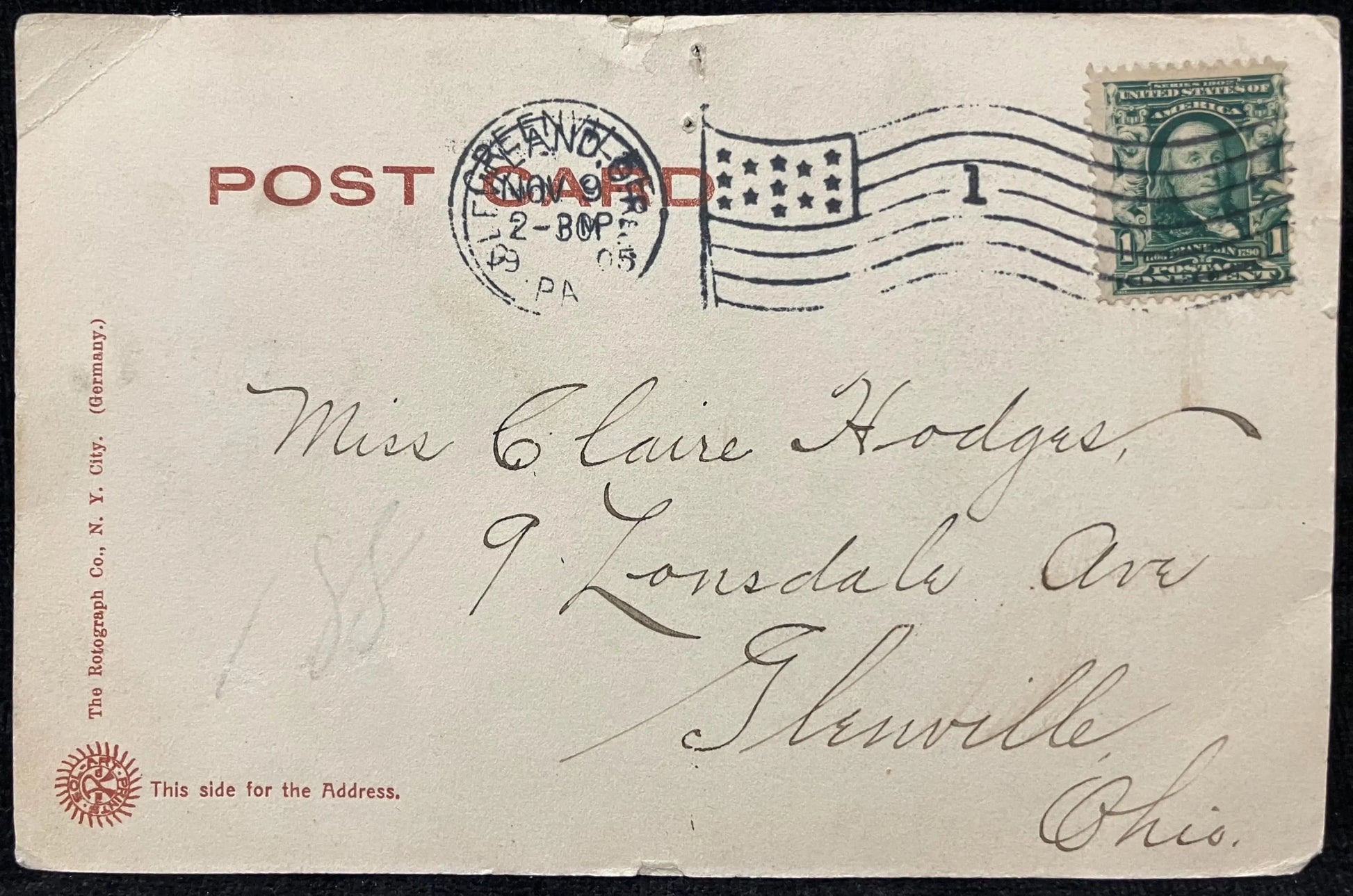 Mailed: Postmark: 1905 green one cent Benjamin Franklin black and white