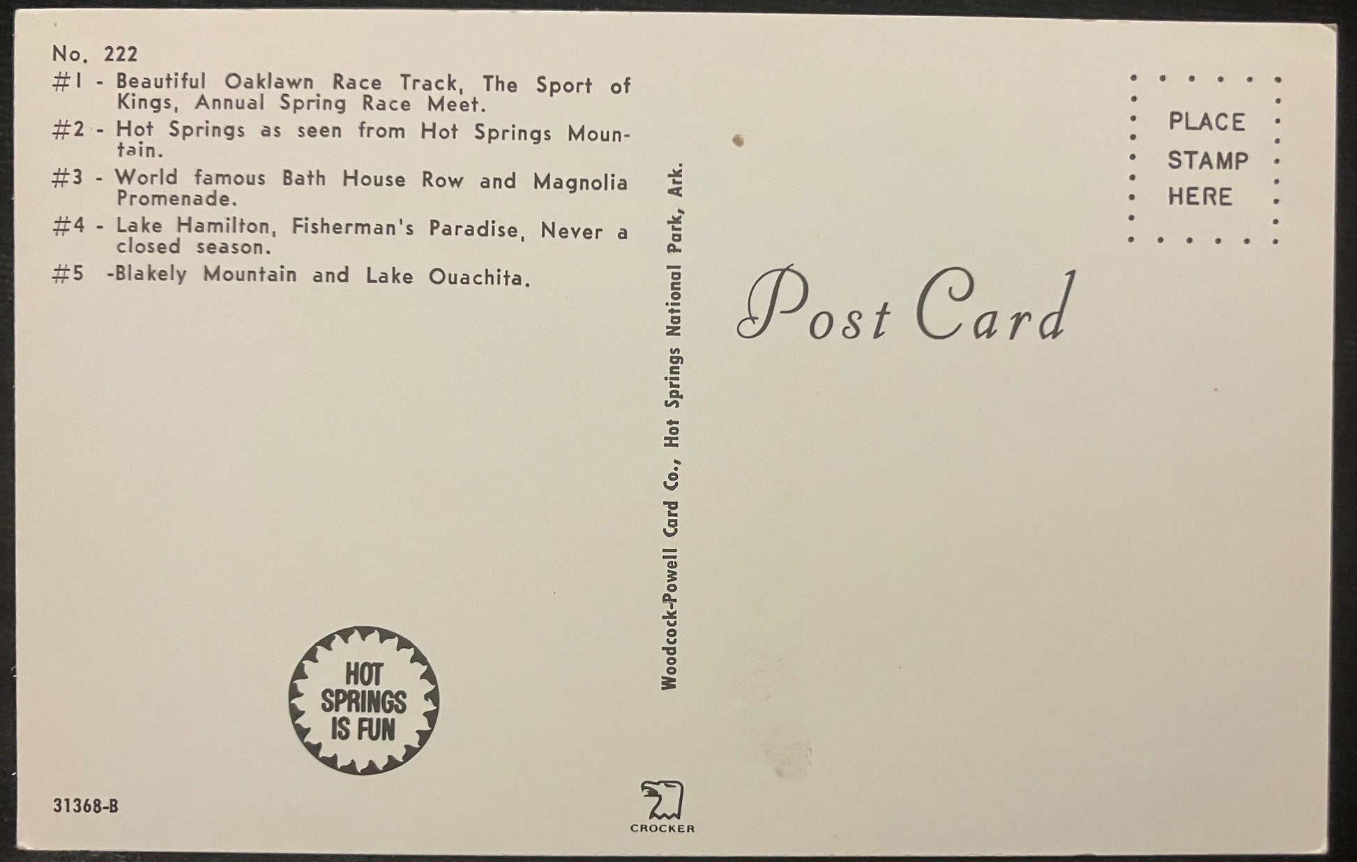 On back: #1 - Beautiful Oaklawn Race Track, The Sprot of Kings, Annual Slring Race Meet. #2 - Hot Springs as seen rom Hot Springs Mountain. #3 - World famous Bath House Row and Magnolia Promenade. #4 - Lake Hamilton, Fisherman’s Paradise, Never a closed season. #5 - Blakey Mountain and Lake Ouachita.