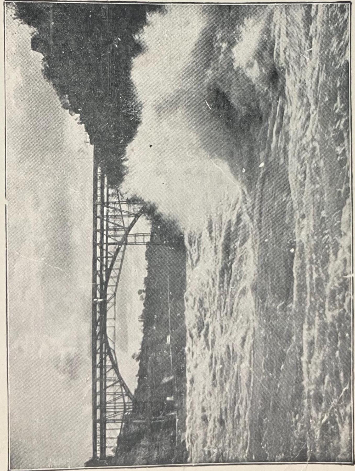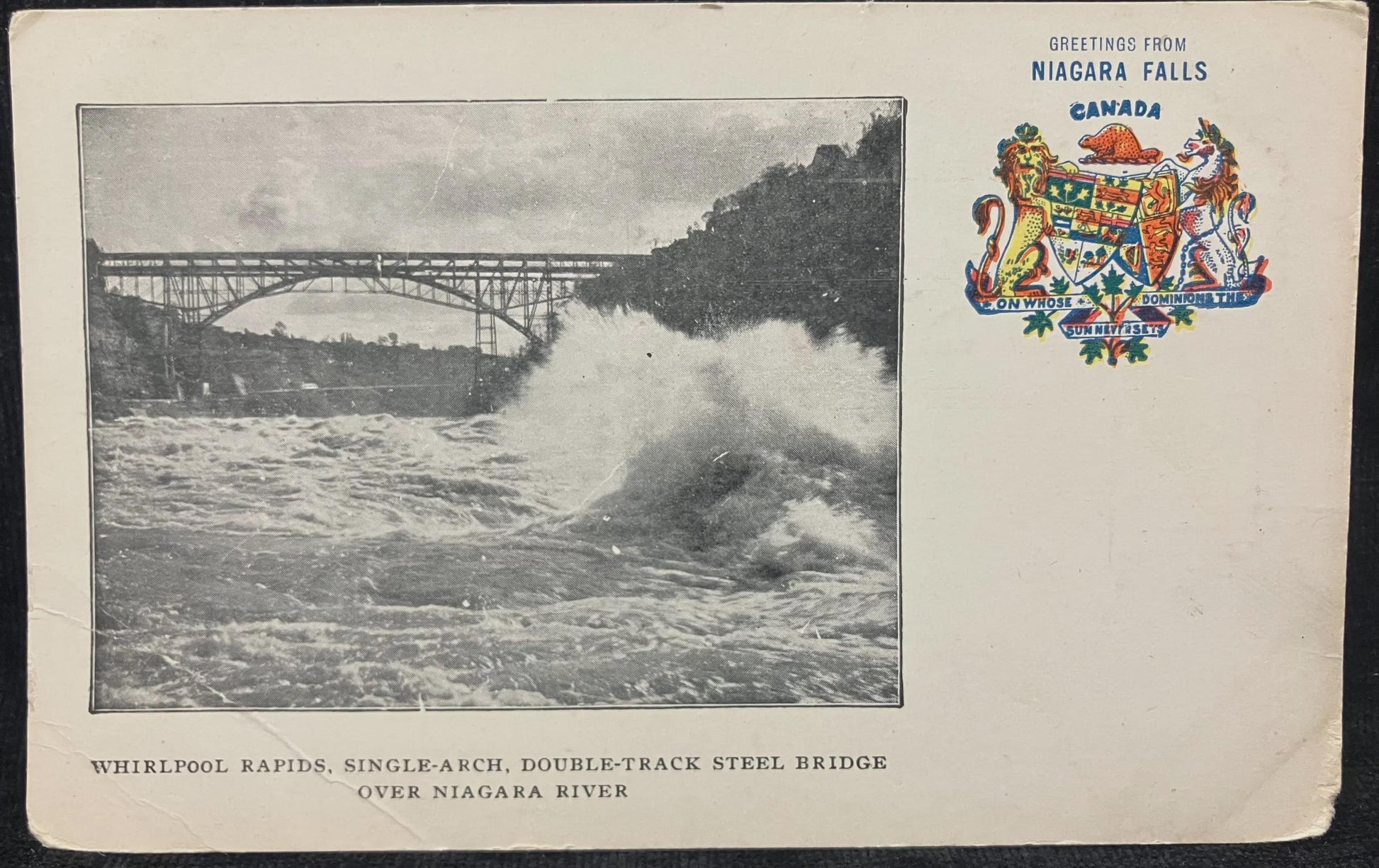 Front: "Greetings from Niagara Falls," a Canadian Coat of Arms, "Whirlpool Rapids, Single-arch, Double-track Steel Bridge over Niagara River"