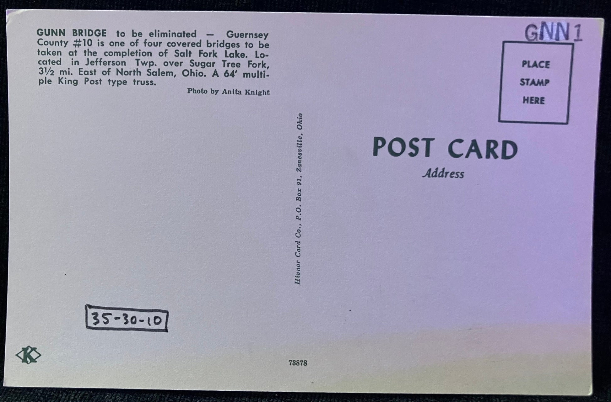 On front: A photo of Gunn Bridge in Guernest County, Ohio