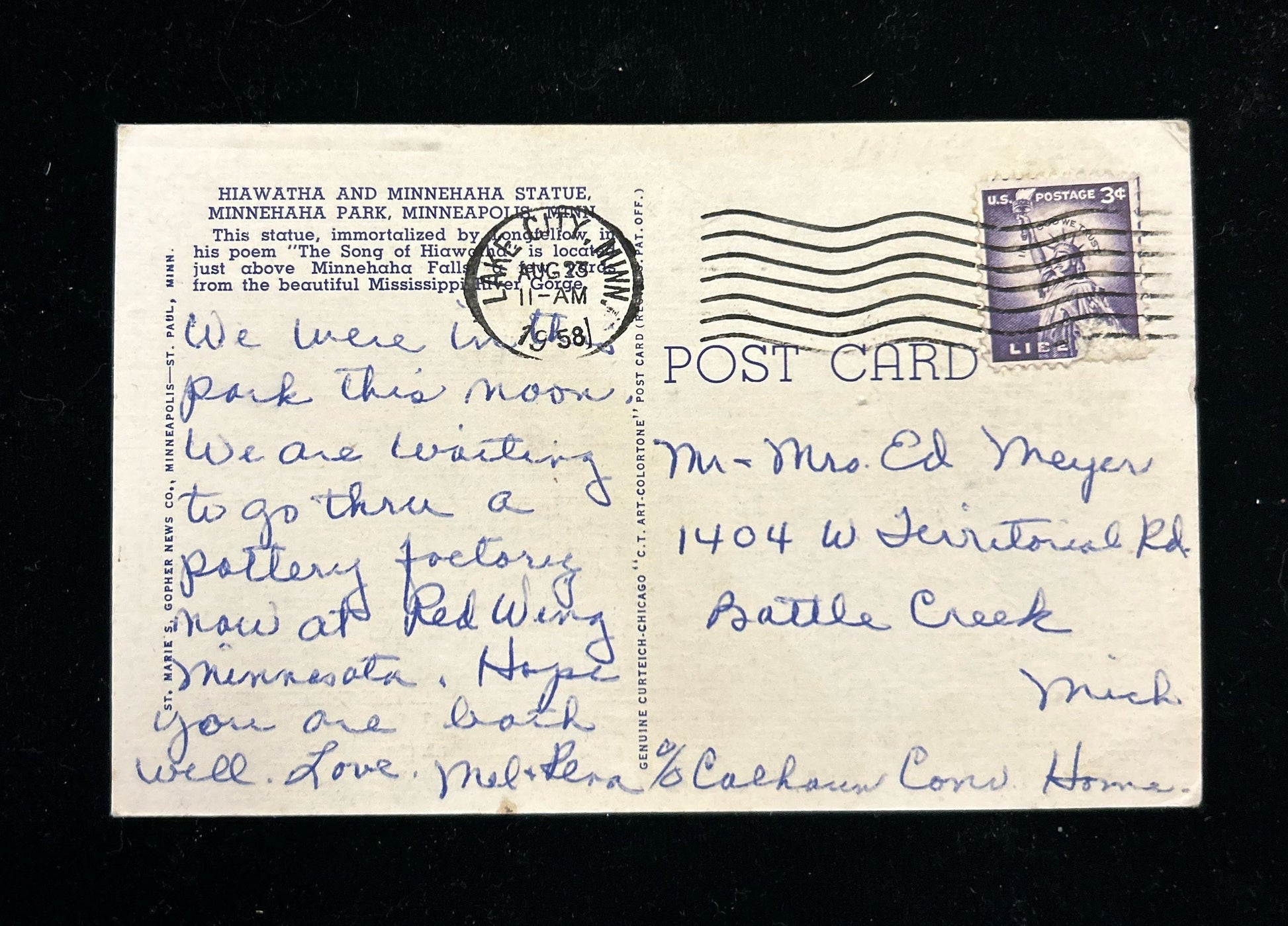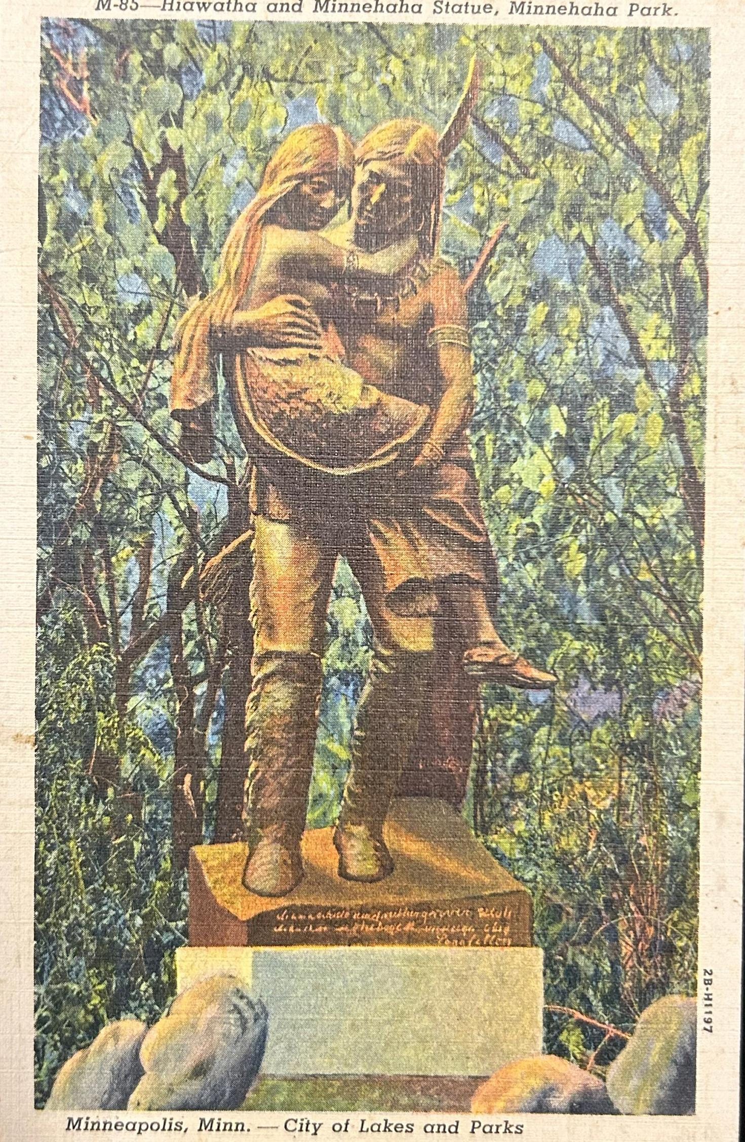 Back: Hiawatha and Minnehaha Statue, Minnehaha Park, Minneapolis, Minn. This statue, immortalized by Longfellow in his poem "The Song of Hiawaha" is located just above Minnehaha Falls & few yards from the beautiful Mississippi River Gorge.