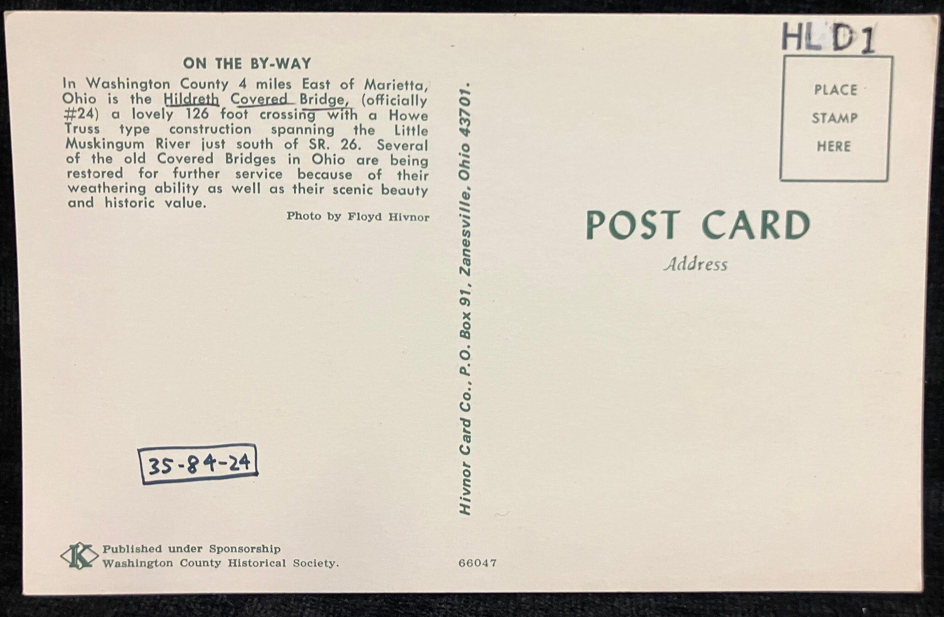 Hildreth Covered Bridge in Washing County, Ohio - Photo: Floyd Hivnor - Vintage Postcard