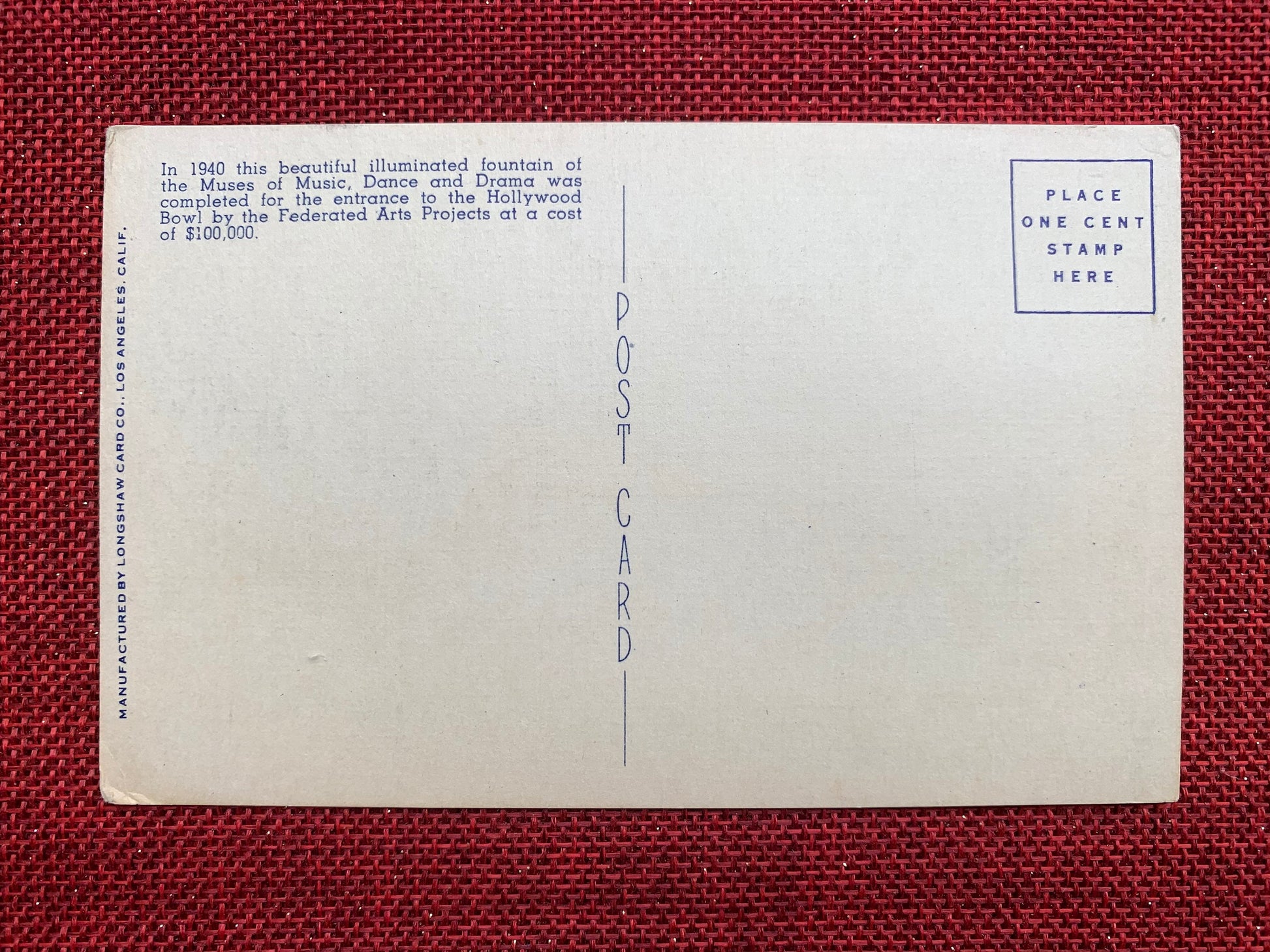 Back Text: "In 1940 this beautiful illuminated fountain of the Muses of Music, Dance and Drama was completed for the entrance to the Hollywood Bowl by the Federated Arts Project at a cost of $100,000."