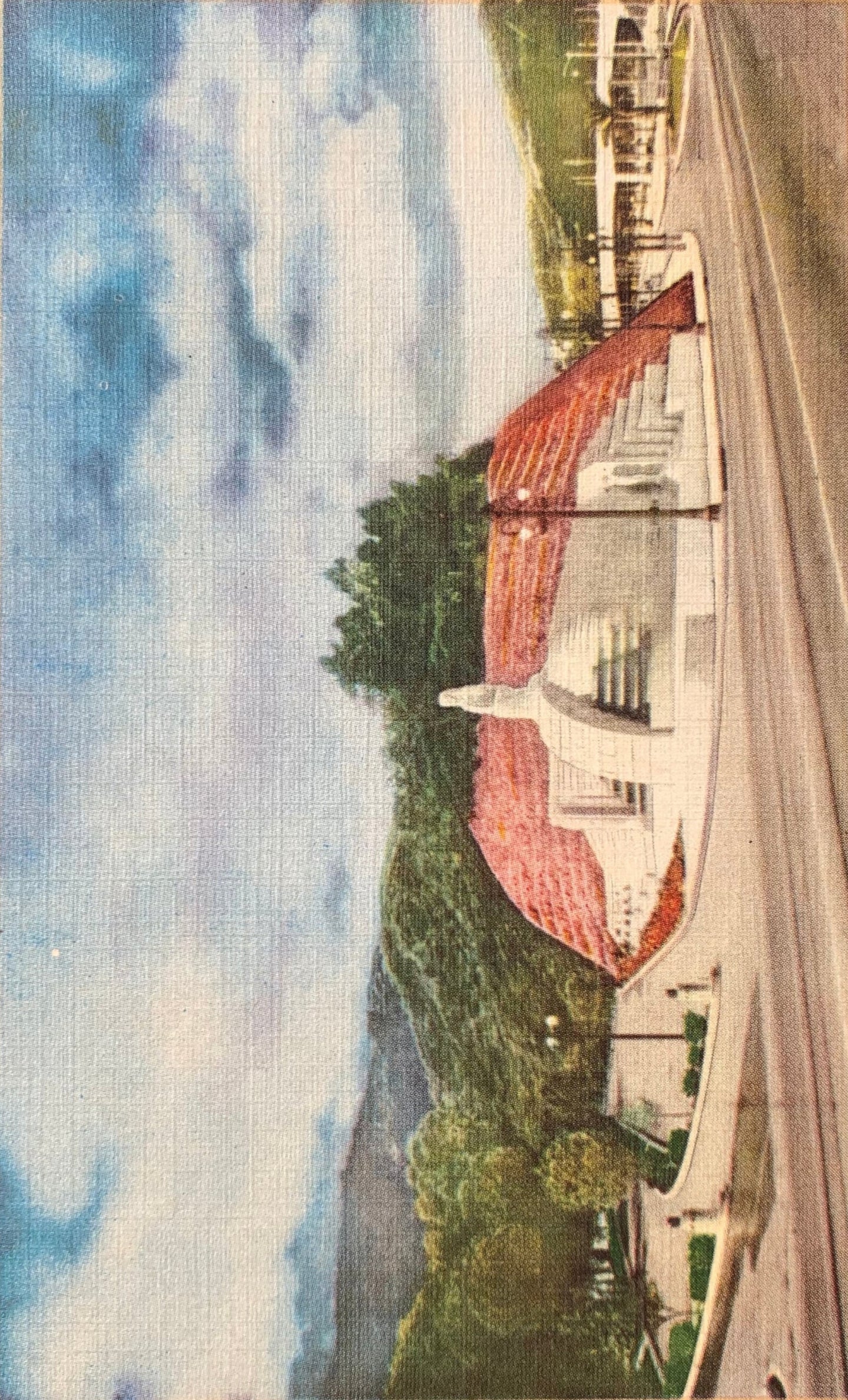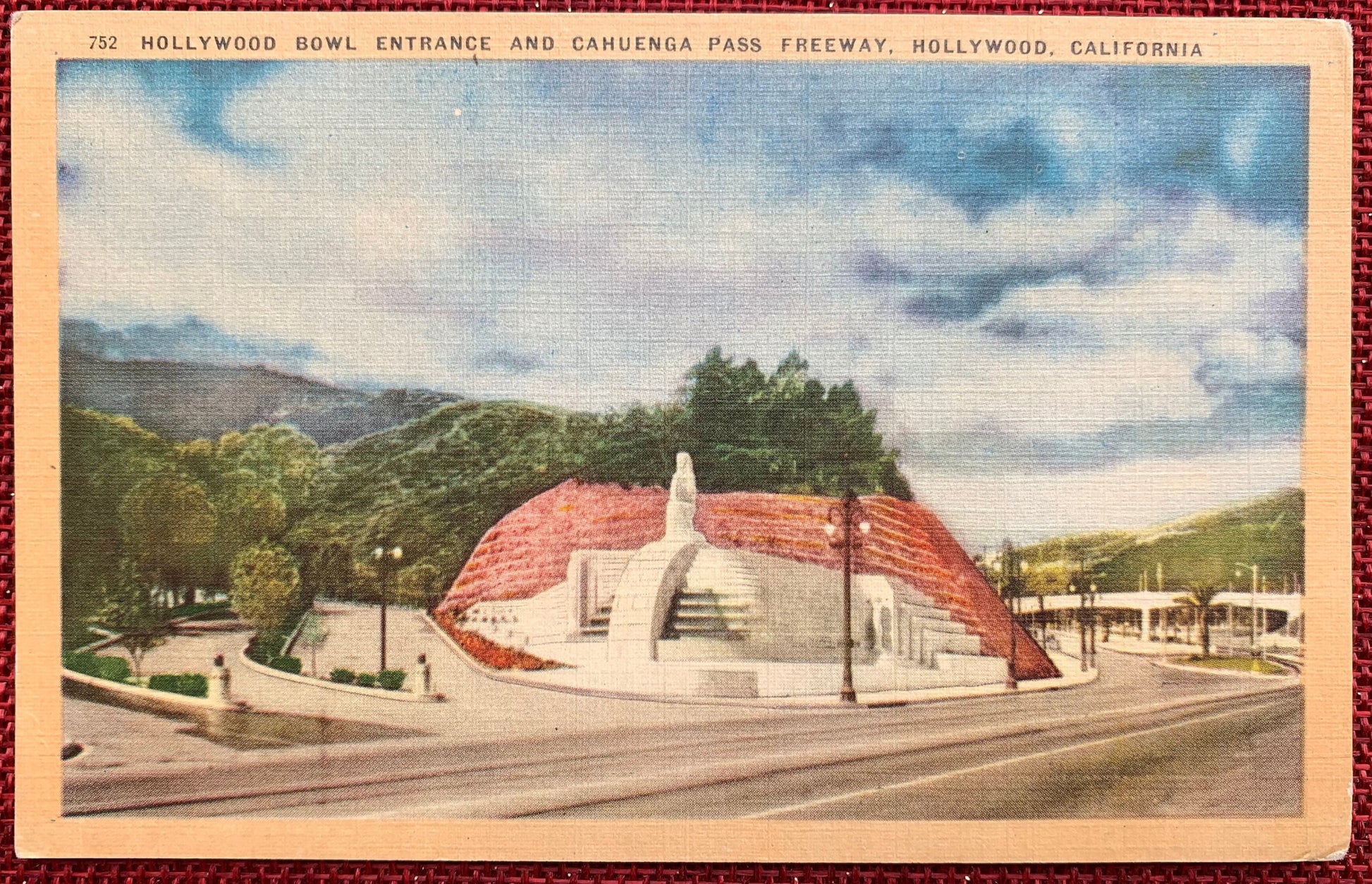 This linen postcard features a hand tinted photograph of the entrance to the Hollywood Bowl and Cahuenga Pass Freeway in Hollywood, California.