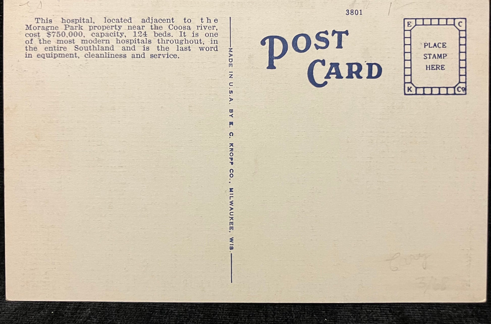 On back: This hospital, located adjacent to the Moragne Park property near the Coosa river, coast $750,000, capacity, 124 beds. It is one of the most modern hospitals throughout the entire Southland and is the last word in equipment, cleanliness and service.