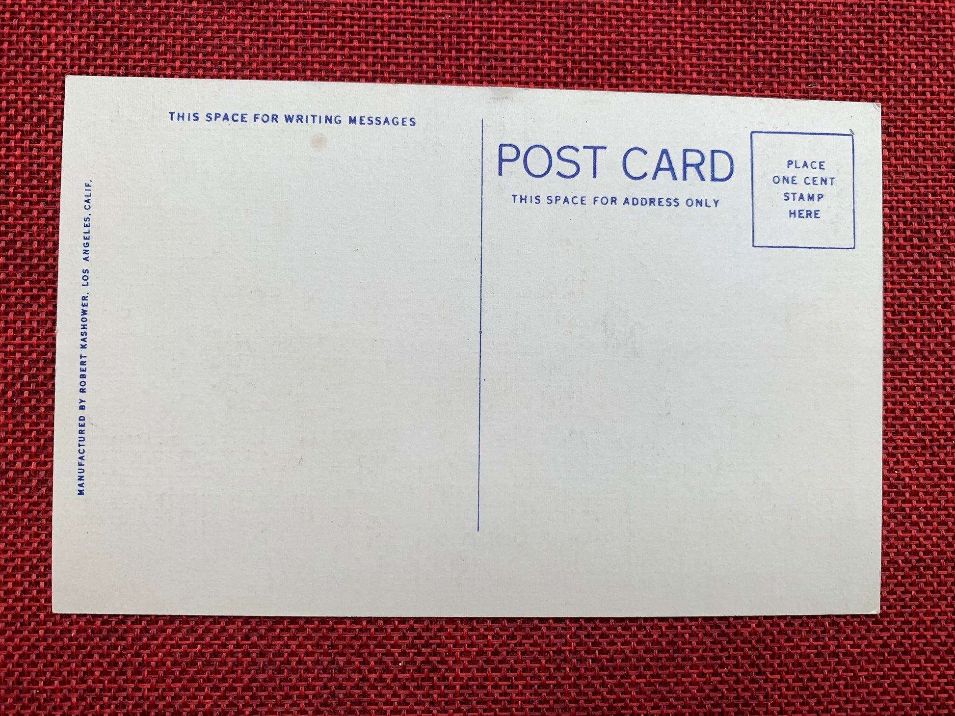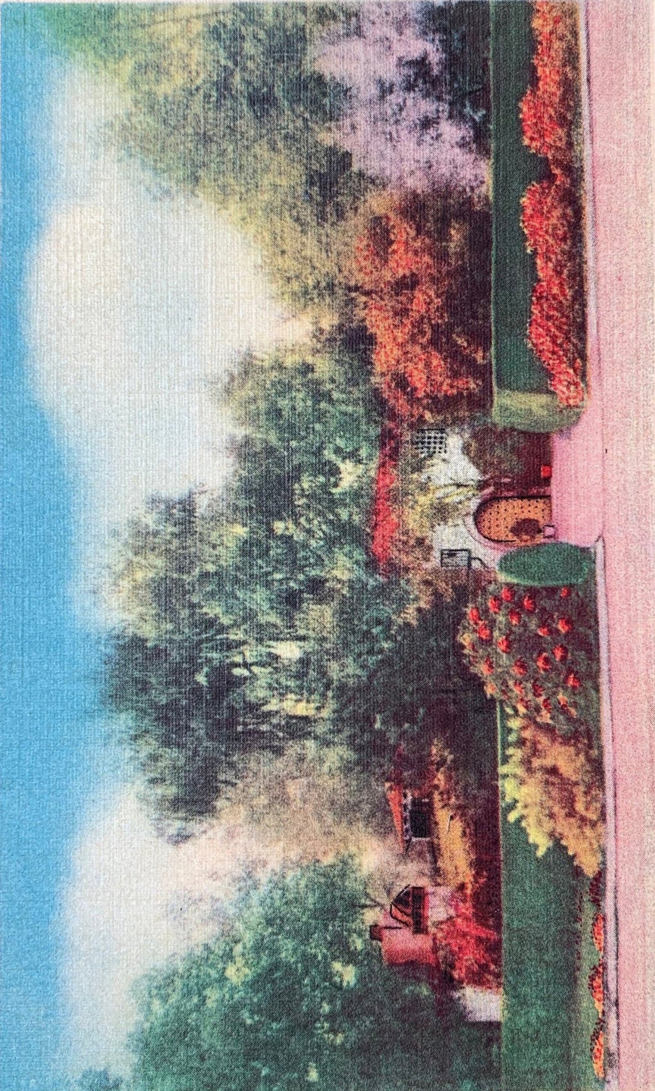 This linen postcard features a hand tinted photograph of the Beverly Hills home of famous actor Tyrone Power in California.