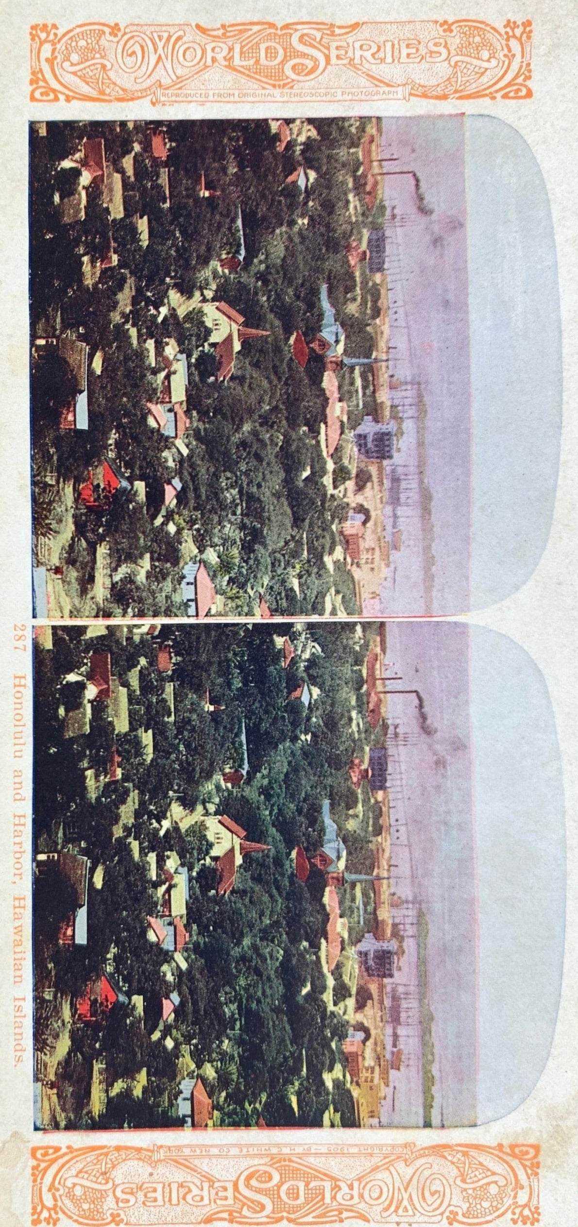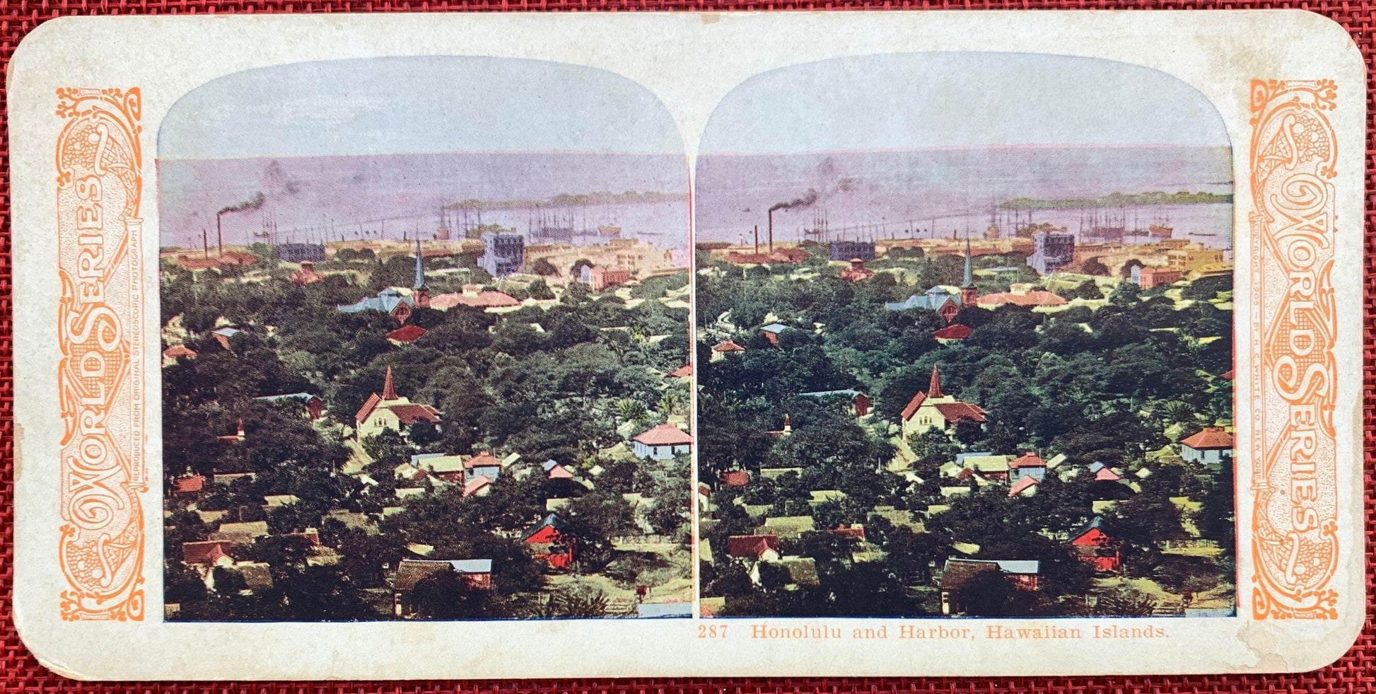 This vintage stereo card features two hand tinted images of Honolulu and the harbor in the Hawaiian Islands. Dating from the early 1900s, this stereo view card is from when the Hawaiian Islands were a US Territory, before Hawaii became a state.