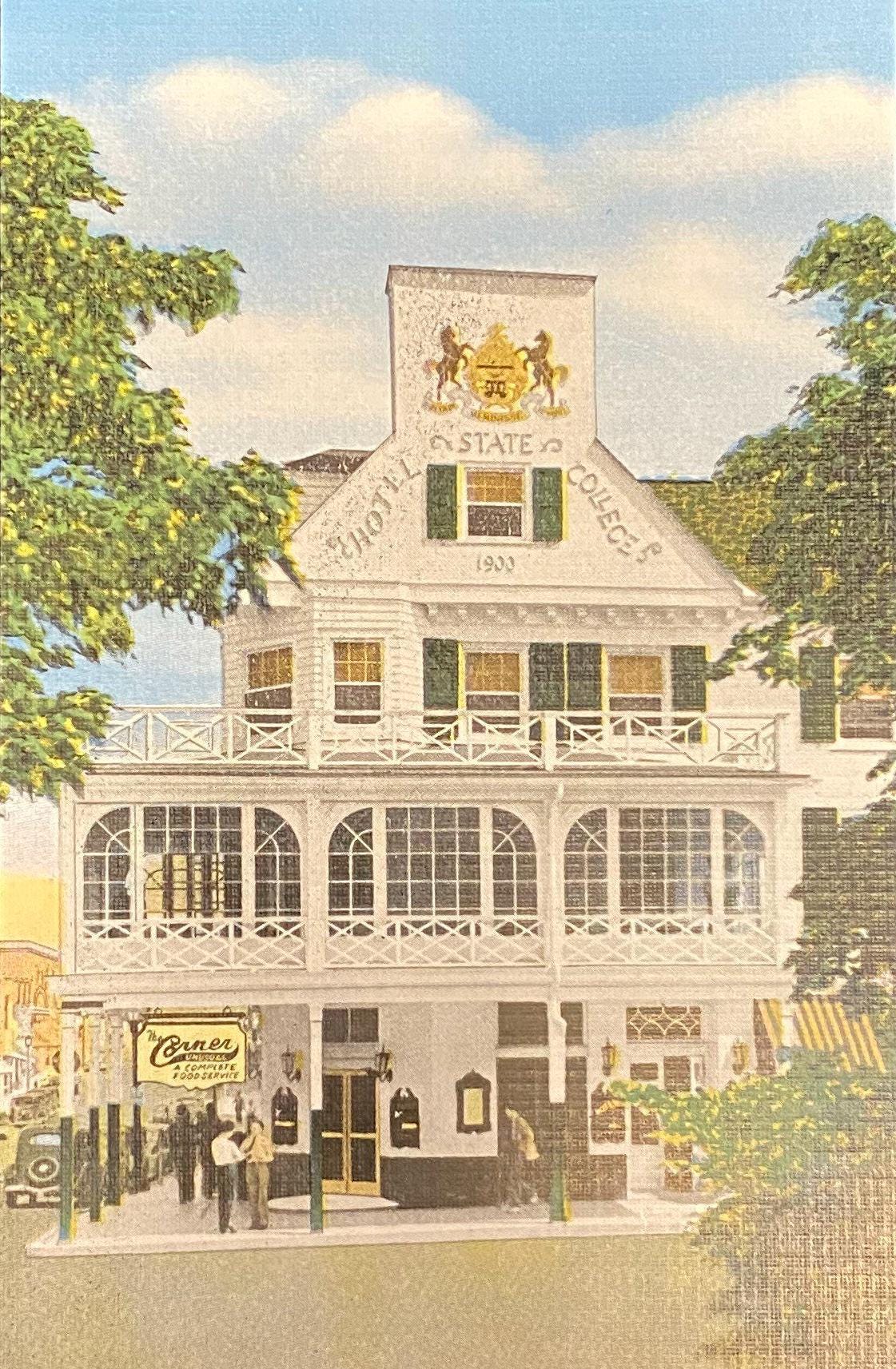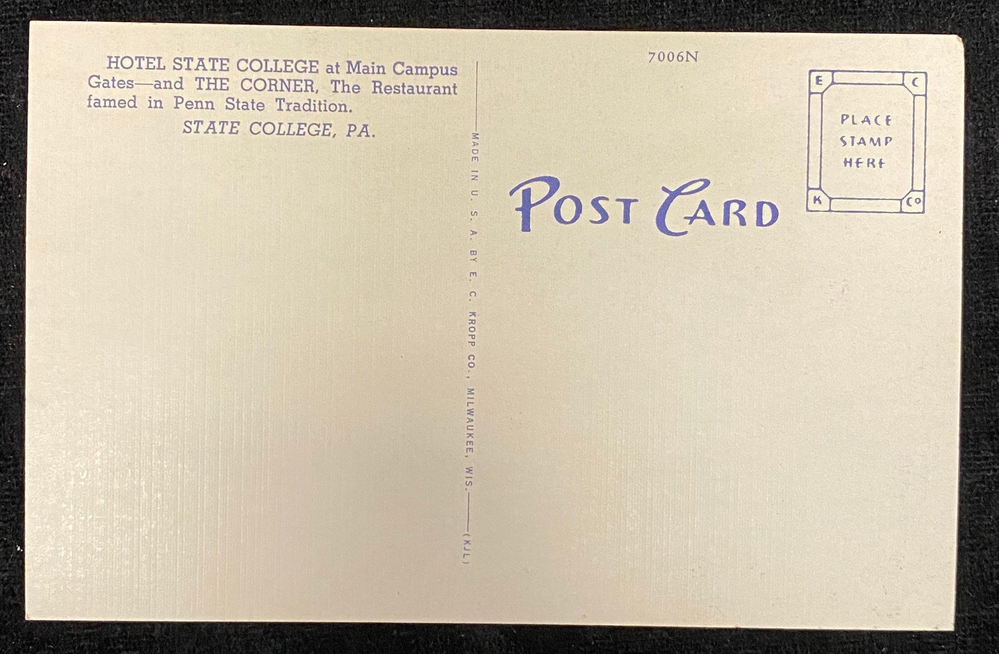 Back: "Hotel State College at Main Campus Gates - and The Corner, The Restaurant famed in Penn State Tradition. State College, PA."