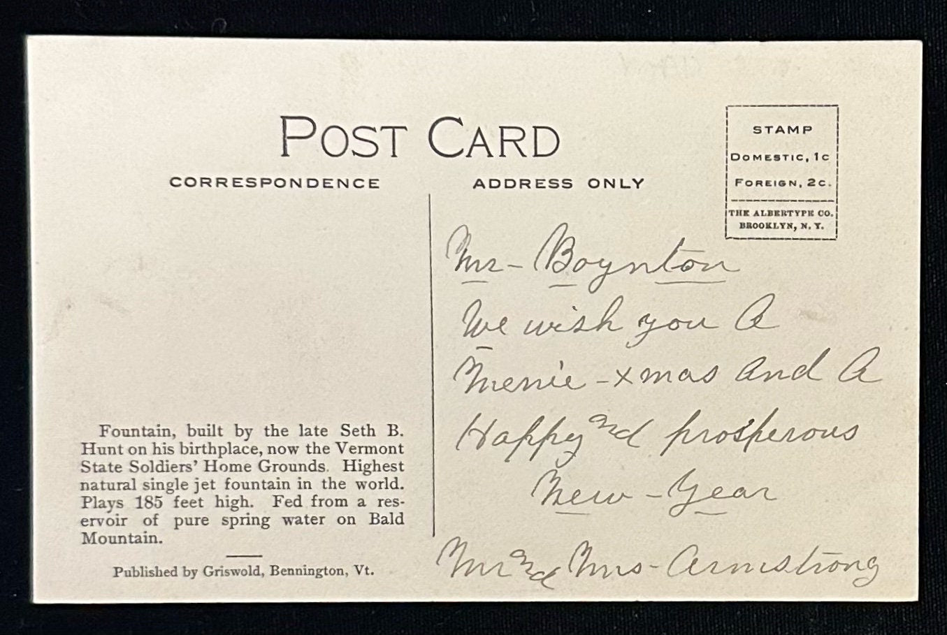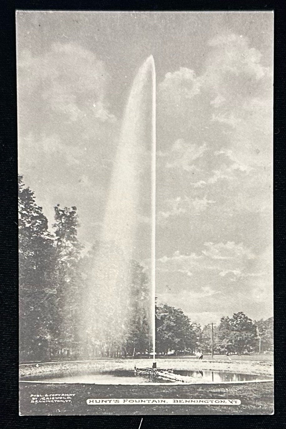 Back Information: Fountain, built by the late Seth B. Hunt on his birthplace, now the Vermont State Soldiers' Home Grounds. Highest natural single jet fountain in the world. Plays 185 feet high. Fed from a reservoir of pure spring water on Bald Mountain.