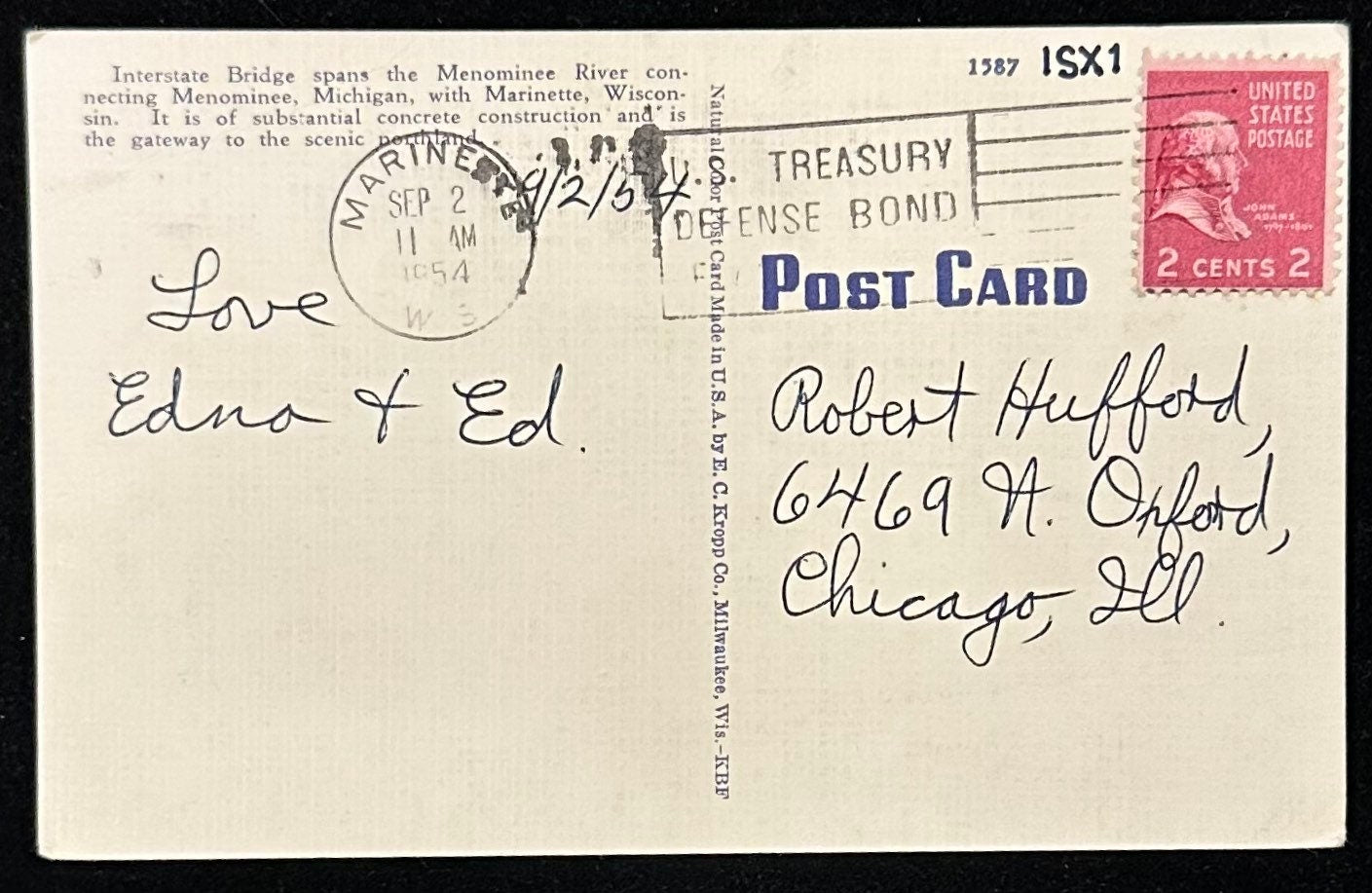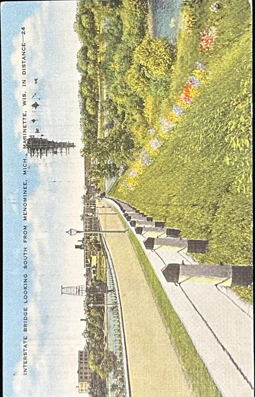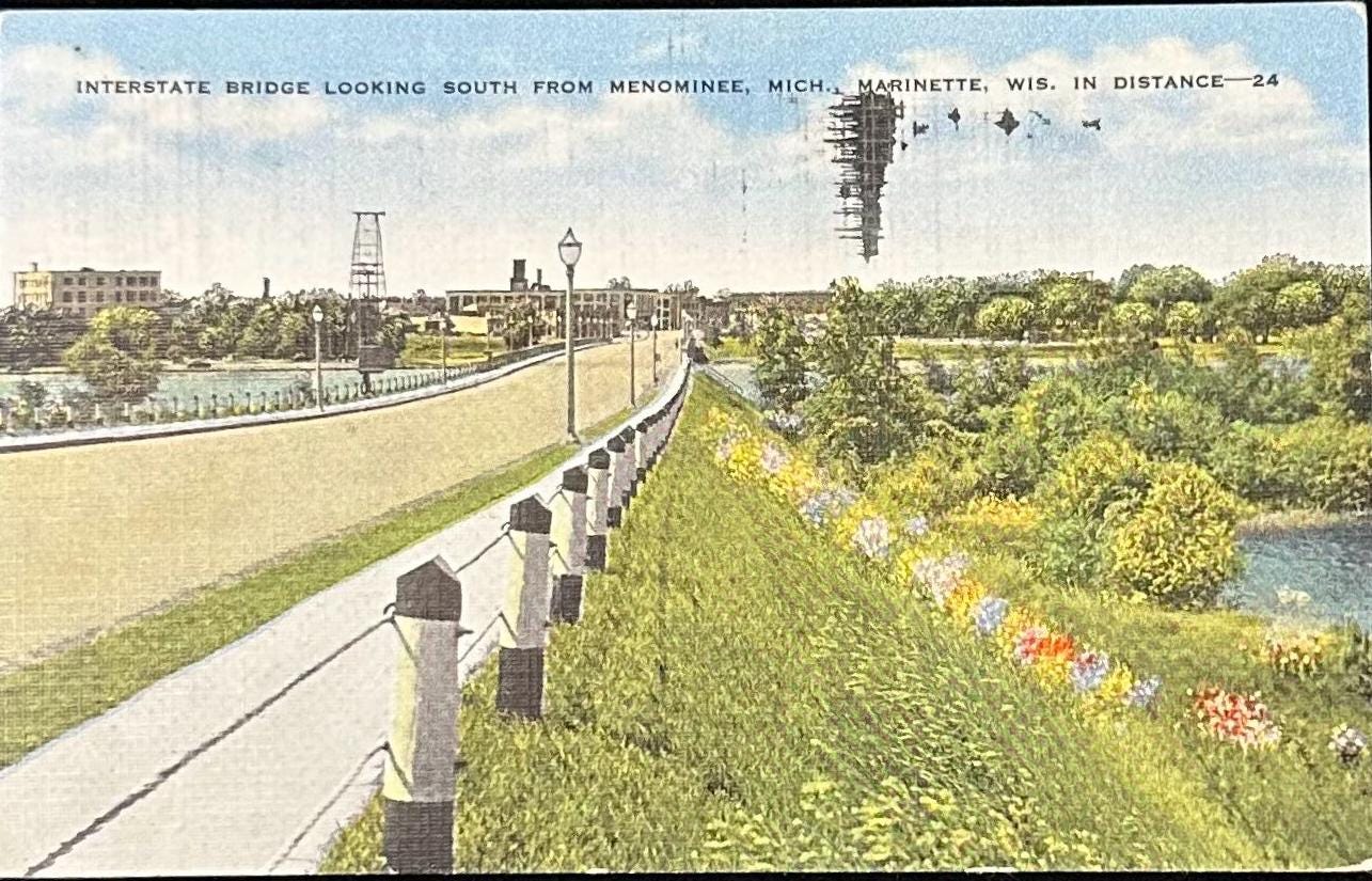 Back: Interstate Bridge spans the Menominee River connecting Menominee, Michigan with Marinette, Wisconsin. It is of substantial concrete construction and is the gateway to the scenic northland. | followed by handwritten note