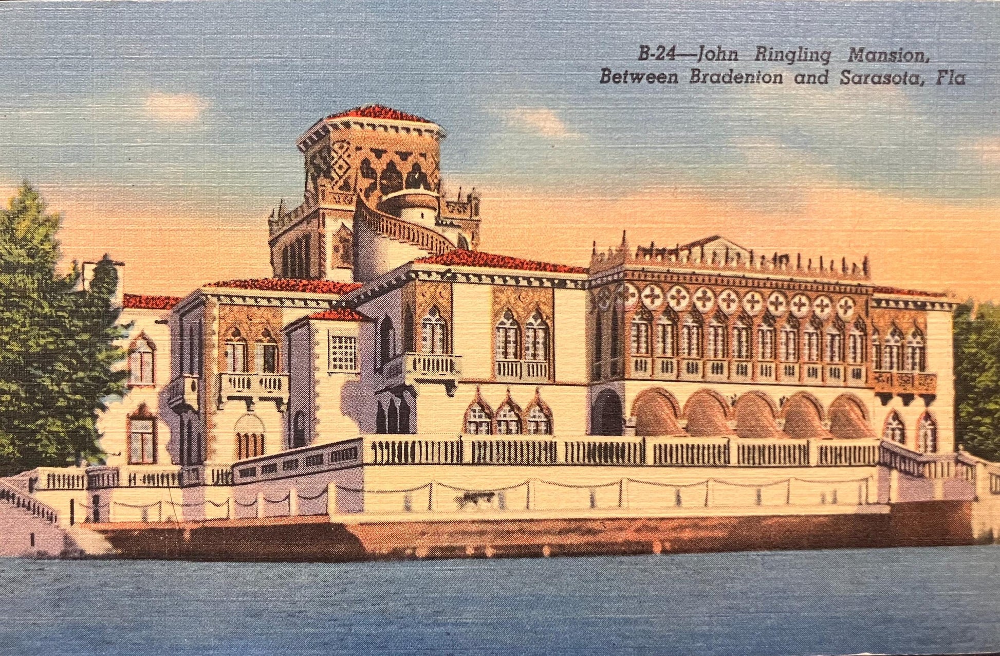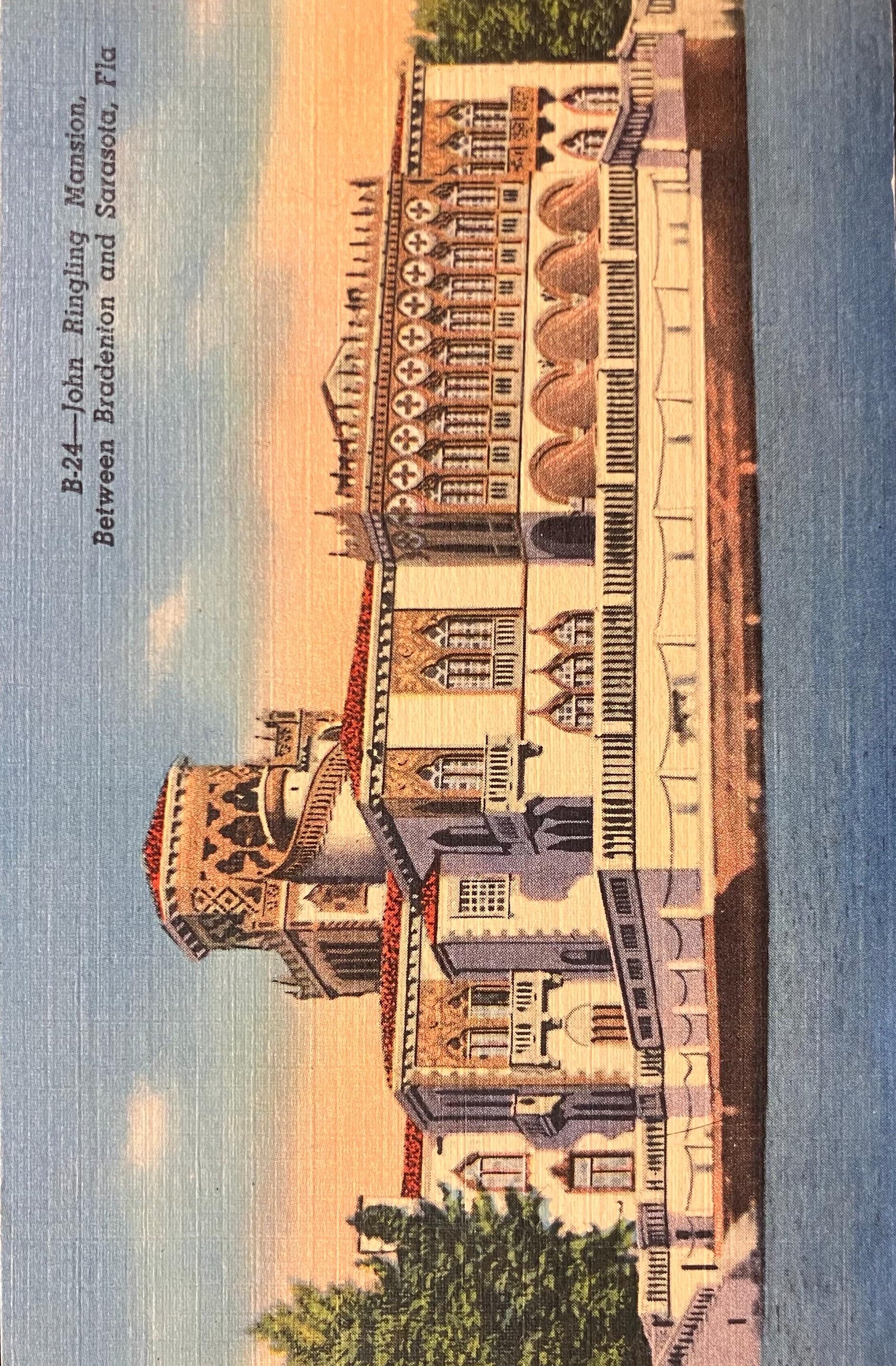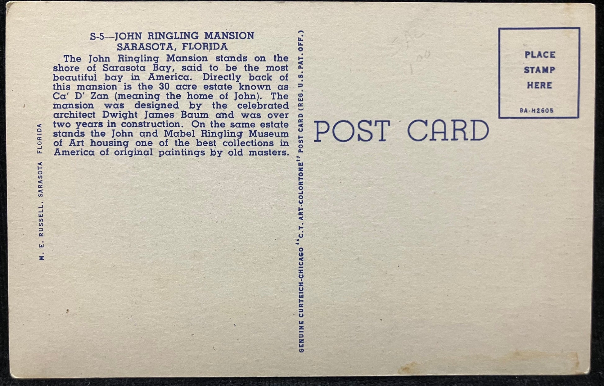 Back: JOHN RINGLING MANSION SARASOTA, FLORIDA The John Ringling Mansion stands on the shore of Sarasota Bay, said to be the most beautiful bay in America. Directly back of this mansion is the 30 acre estate known as Ca’ D’ Zan (meaning the home of John_. The mansion was designed by the celebrated architect Dwight James Baum and was over two years in construction. On the same estate stands the Johna No Mabel Ringling Museum of Art housing one of the best collections in America of original paintings by old masters