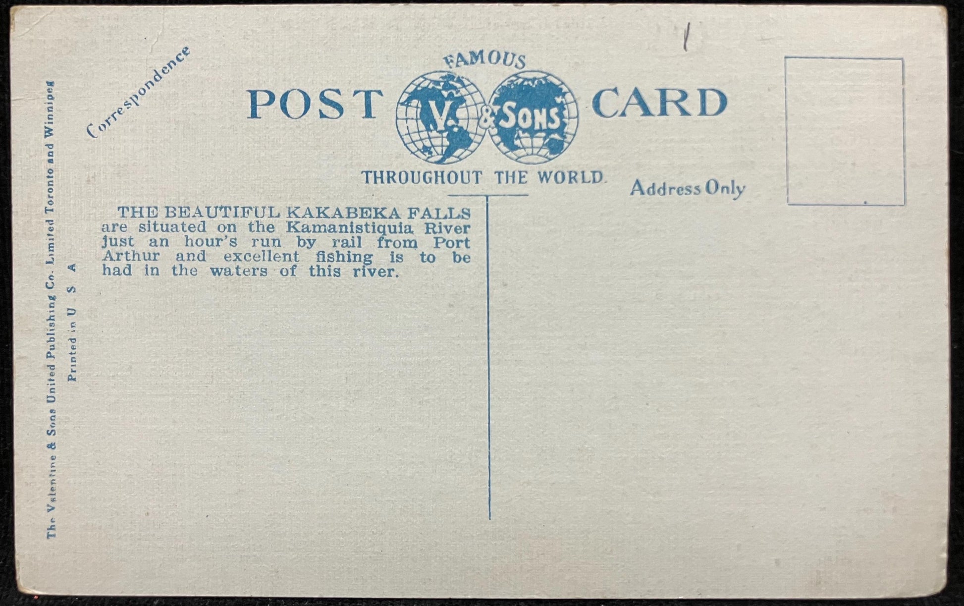 Back: THE BEAUTIFUL KAKABEKA FALLS are situated on the Kamanistiquia River just an hour’s run by rail from Port Arthur and excellent fishing is to be had in the waters of this river.