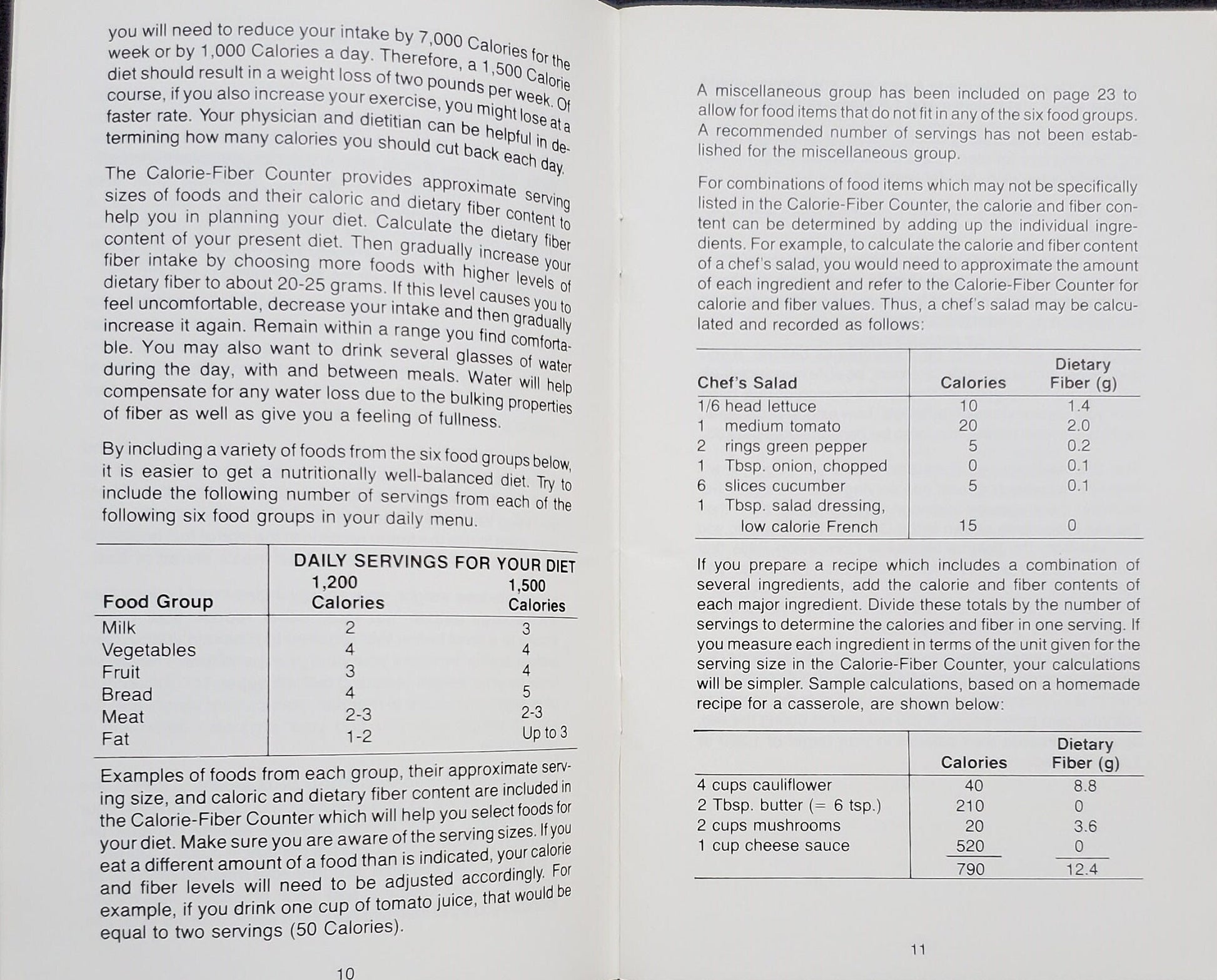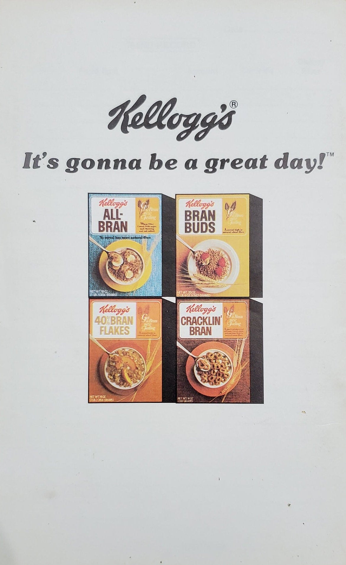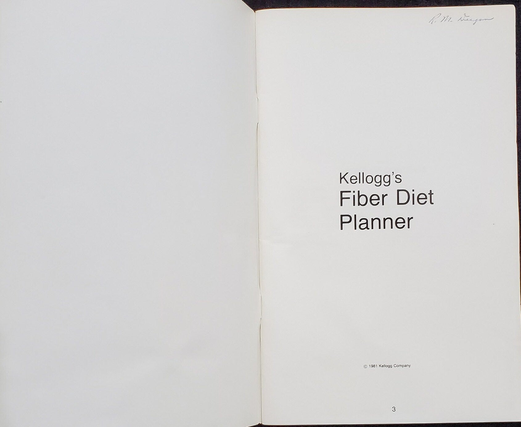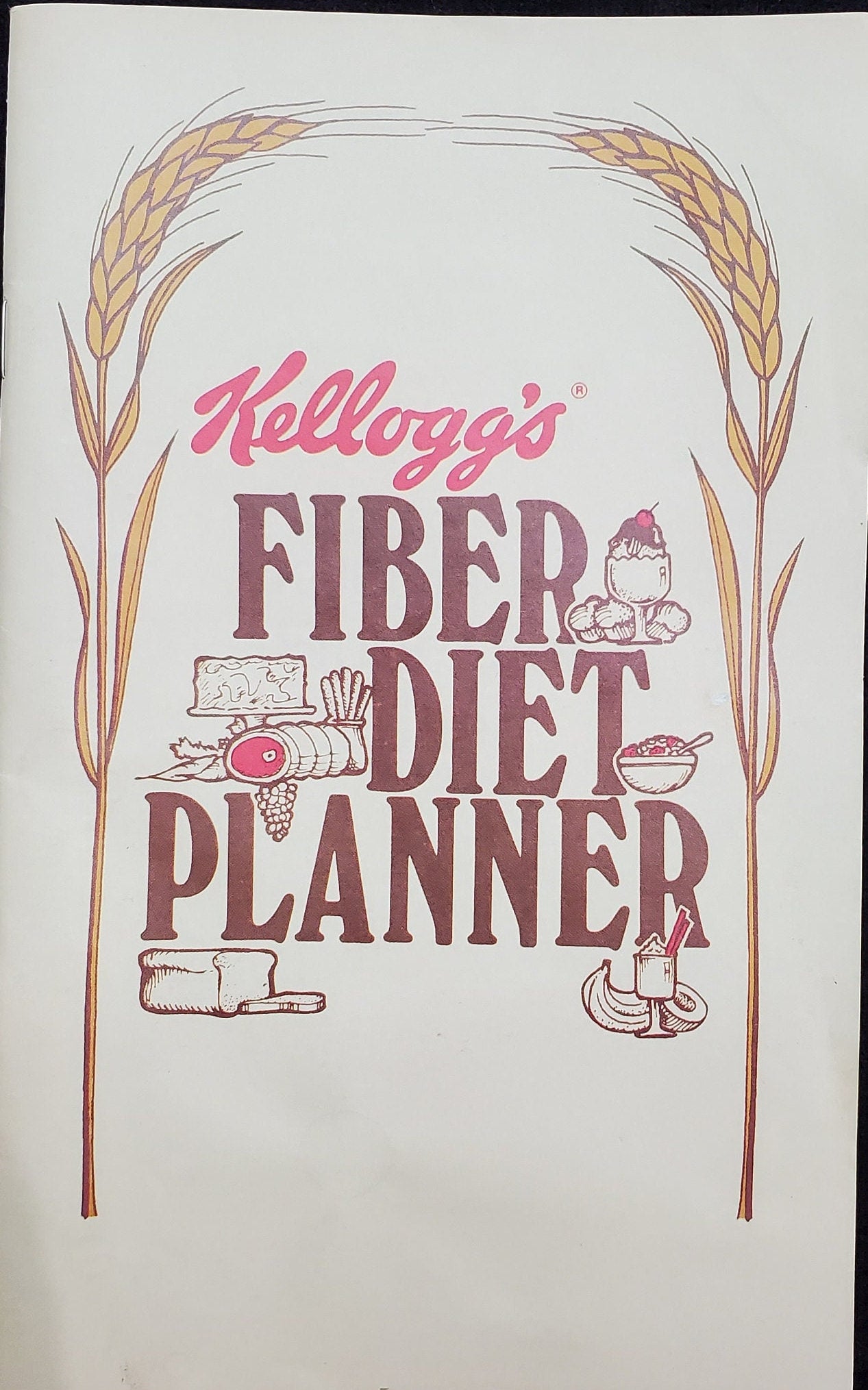Kellogg's FiberDiet Planner, Kellogg's Give Away Health Booklet -Free Fiber Diet Circular from Kellogg's- Kellogg's Cereal Promotional Flyer. This is a guide on how to follow and use a fiber diet. Inside, there is a breakdown of all the food groups and serving sizes of items in those groups, a planned meal guide for seven days, a few recipes, and a menu record. It came out in the 1980s when Fiber became a buzz word.