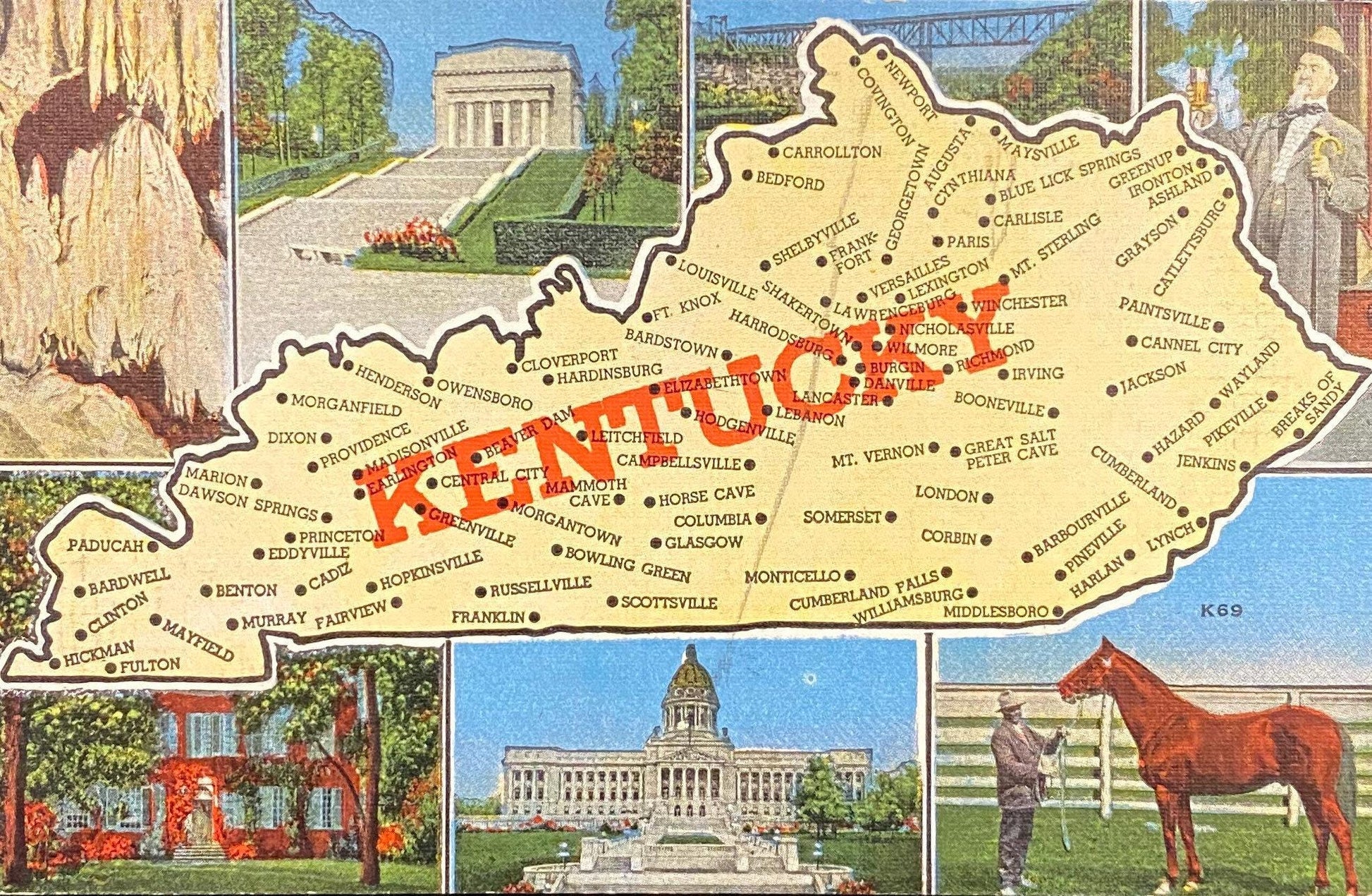 Back: "Top Row: Mammoth Onyx Cave, Horse Cave...Lincoln Memorial, Hodgenville...High Bridge over Kentucky River...Julep-up...Bottom Row: My Old Kentucky...State Capitol...Man O'War."