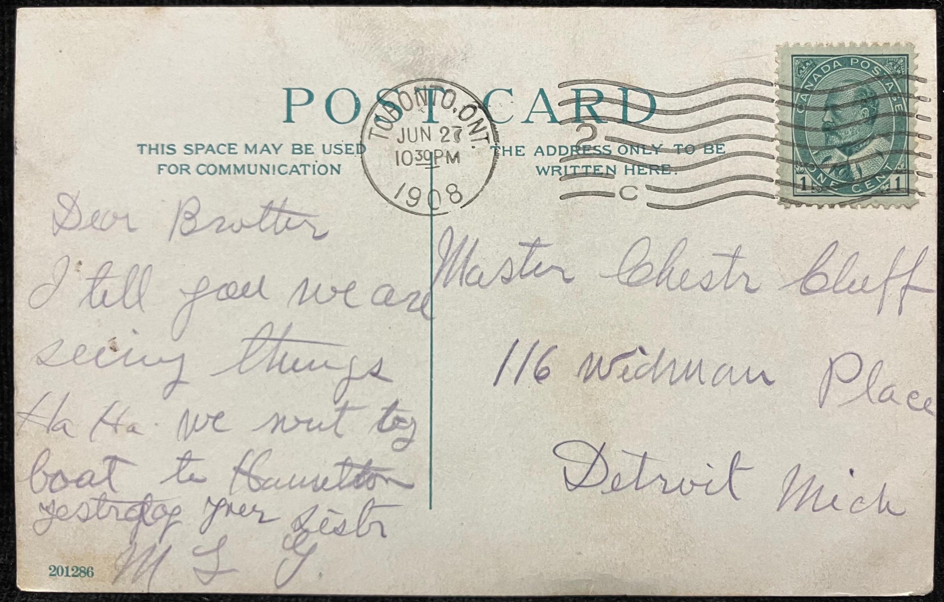 Mailed: Postmark: 1908 green one cent King Edward VII stamp