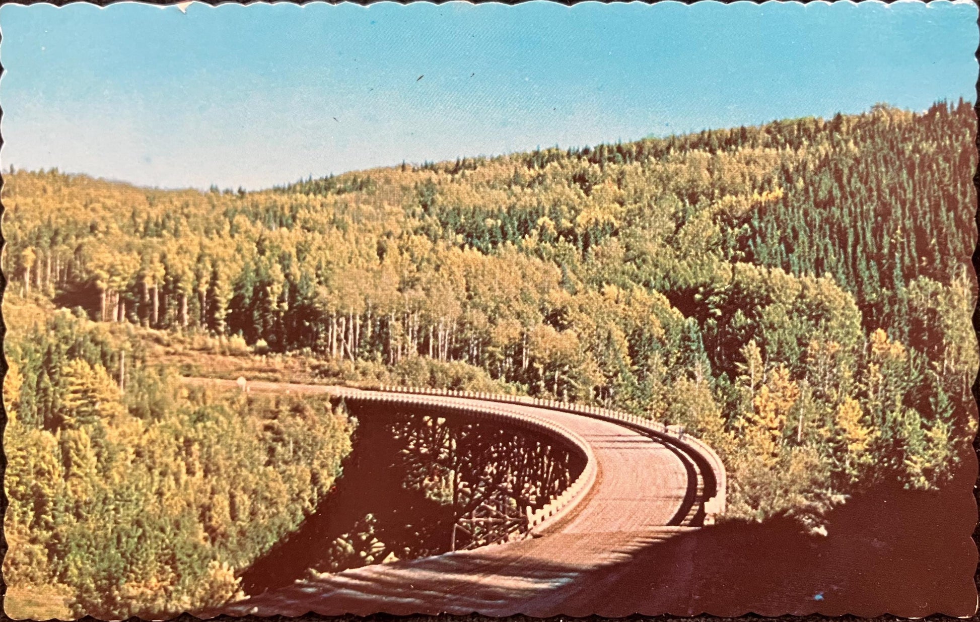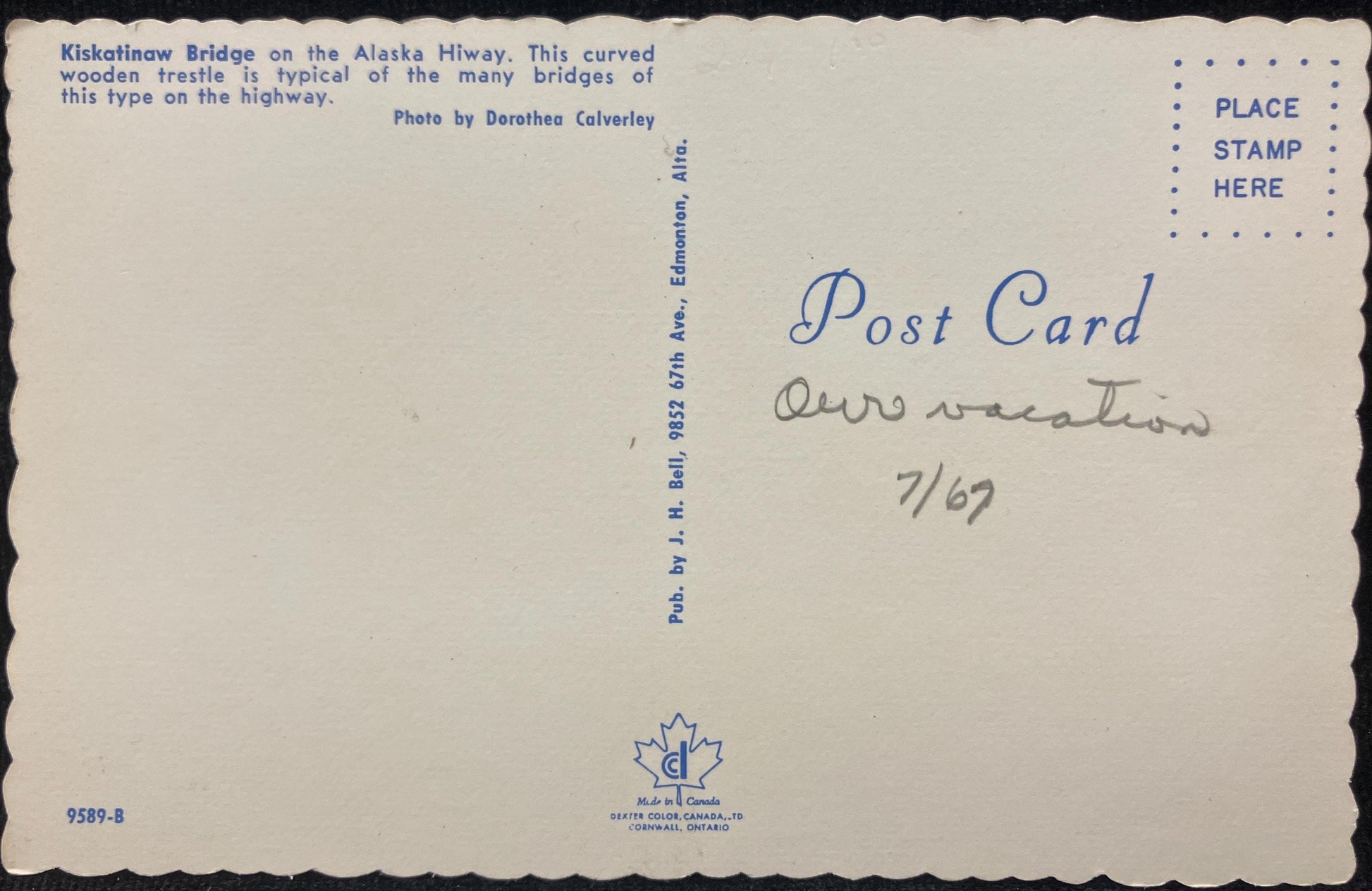 Back: Kiskatinaw Bridge on the Alaska Hiway. This curved wooden trestle is typical of the many bridges of this type on the highway.
