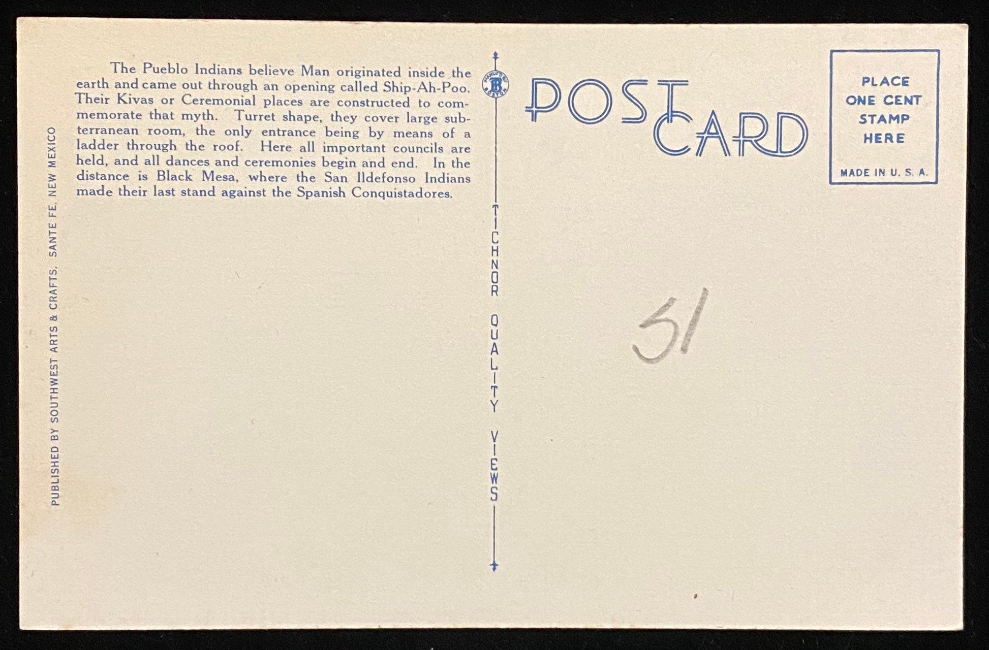 "The Pueblo Indians believe Man originated inside the earth and came out through an opening called Ship-Ah-Poo. Their Kivas or Ceremonial places are constructed to commemorate that myth. Turret shape, they cover large subterranean room, the only entrance being by means of a ladder through the roof. Here all important councils are held, and all dances and ceremonies begin and end. In the distance is Black Mesa, where the San Ildefonso Indians made their last stand against the Spanish Conquistadores."